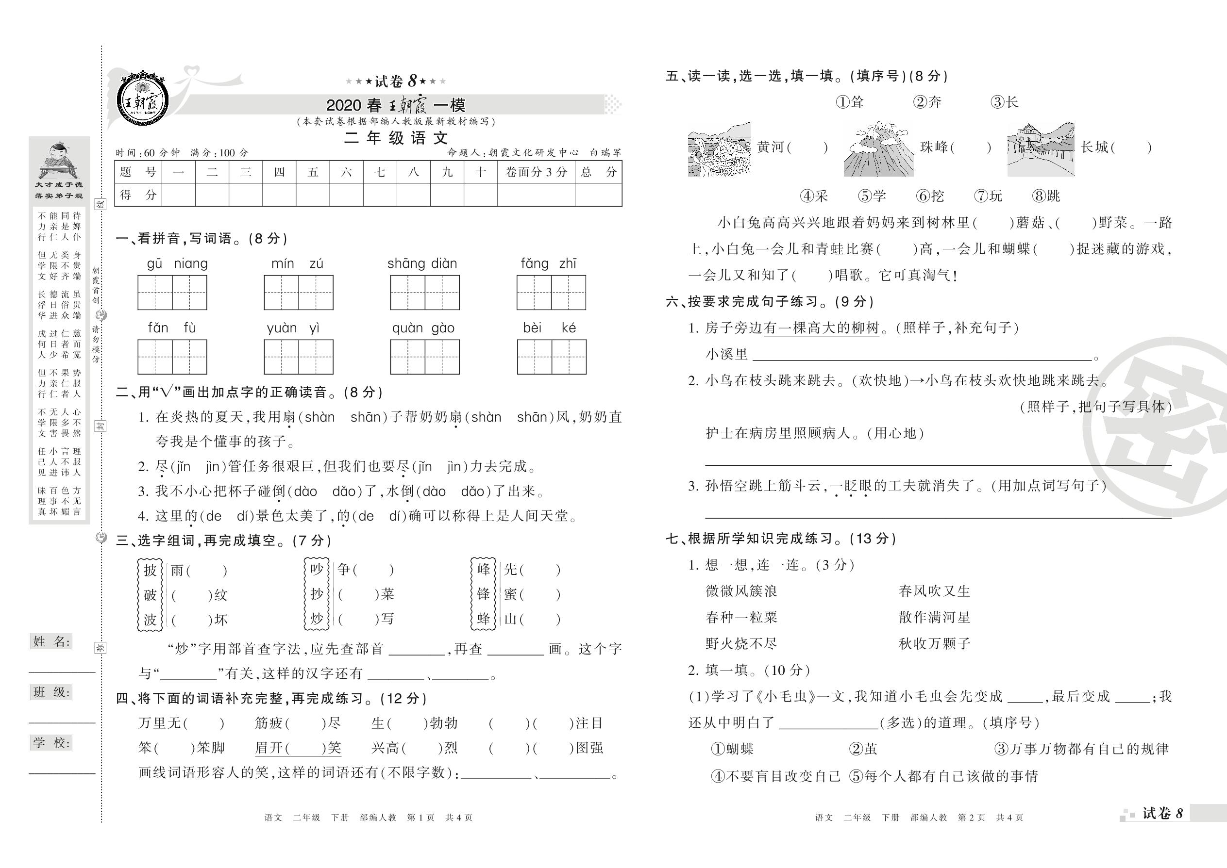 王朝霞期末模拟卷二年级下册语文(人教版)_R21080170030【8】