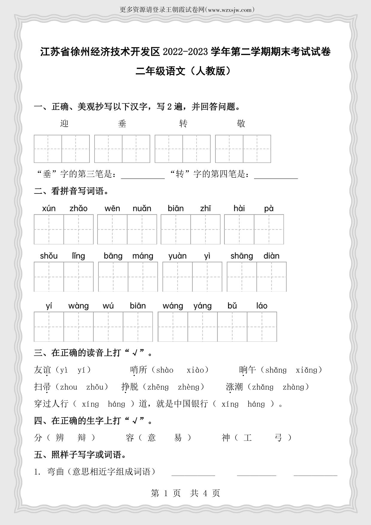 江苏省徐州经济技术开发区2022-2023学年第二学期期末考试试卷二年级语文(人教版)