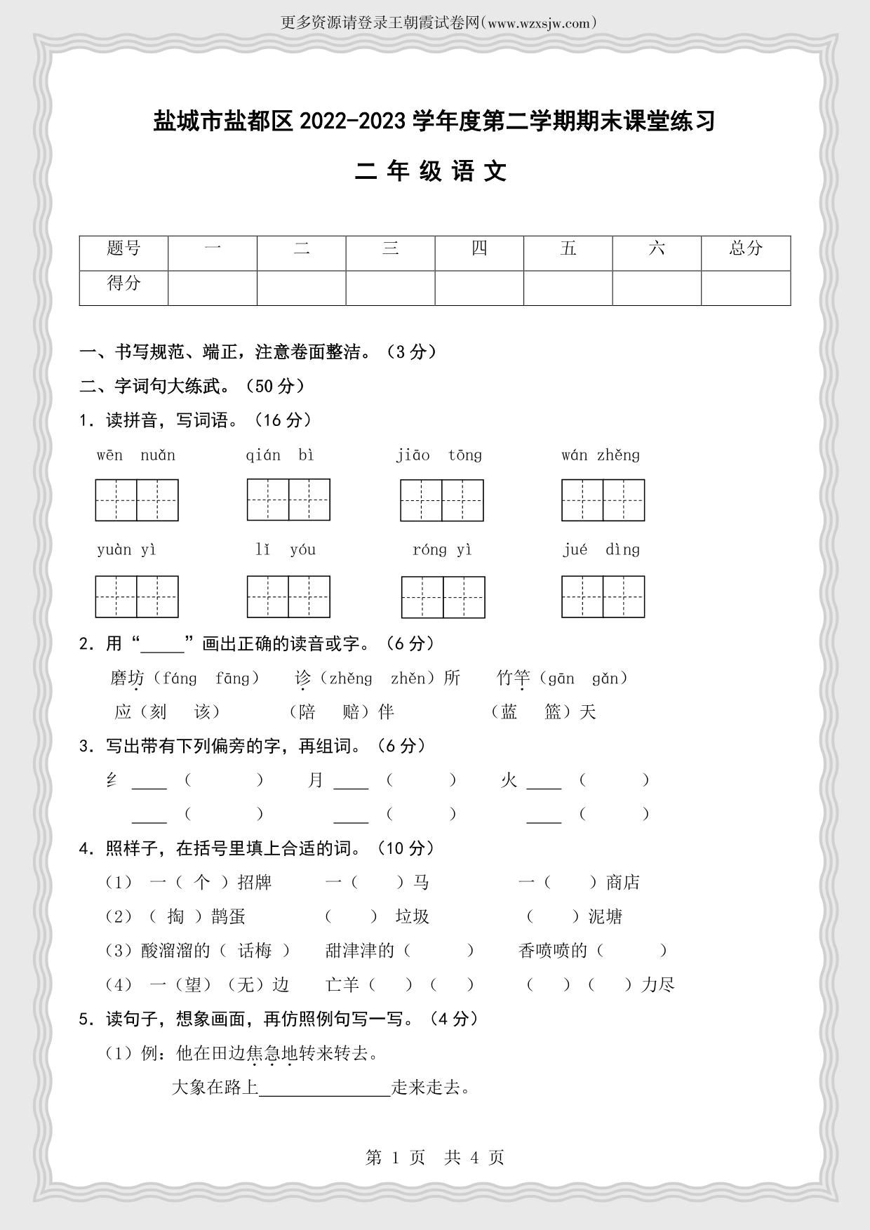 江苏省盐城市盐都区2022-2023学年下学期期末课堂练习二年级语文(人教版)