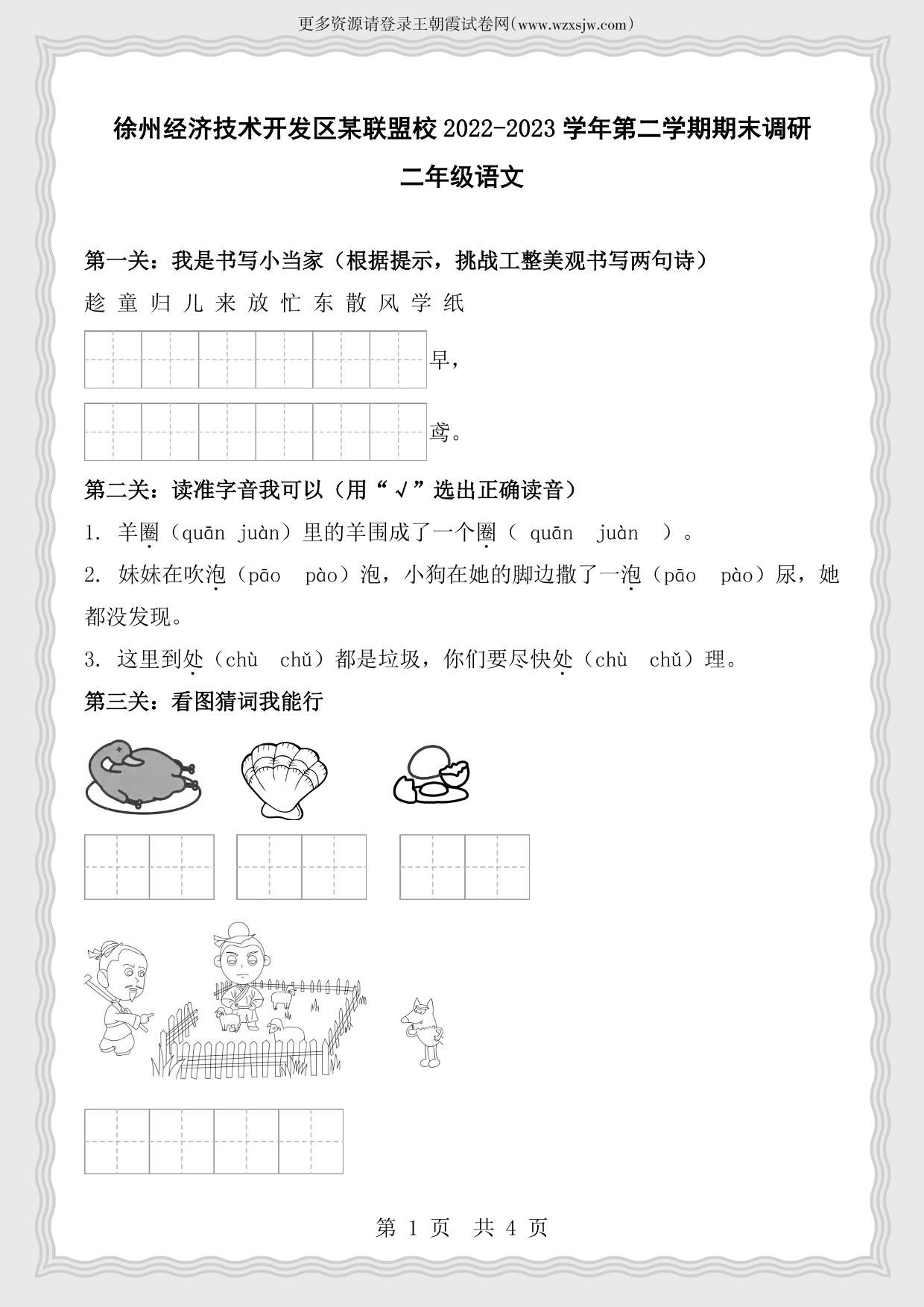 江苏省徐州经济技术开发区某联盟校2022-2023学年第二学期期末调研二年级语文(人教版)
