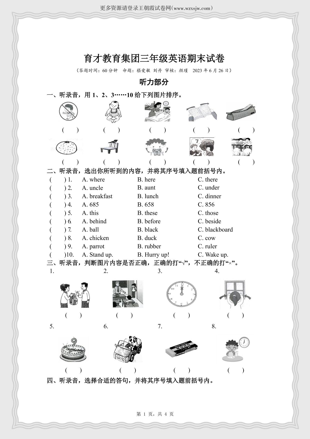 江苏省扬州市育才教育集团2022-2023学年第二学期期末试卷三年级英语(译林版)
