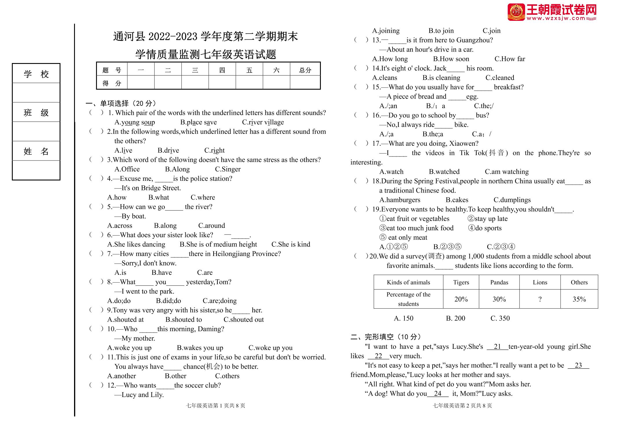 七年级英语人教版下册期末卷
