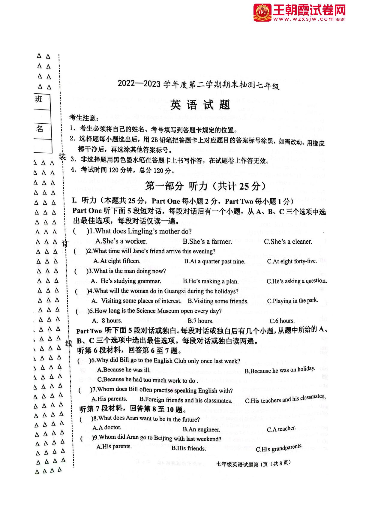 黑龙江省大庆市杜尔伯特蒙古族自治县2022-2023学年度第二学期期末抽测七年级英语(外研版)【五四制】