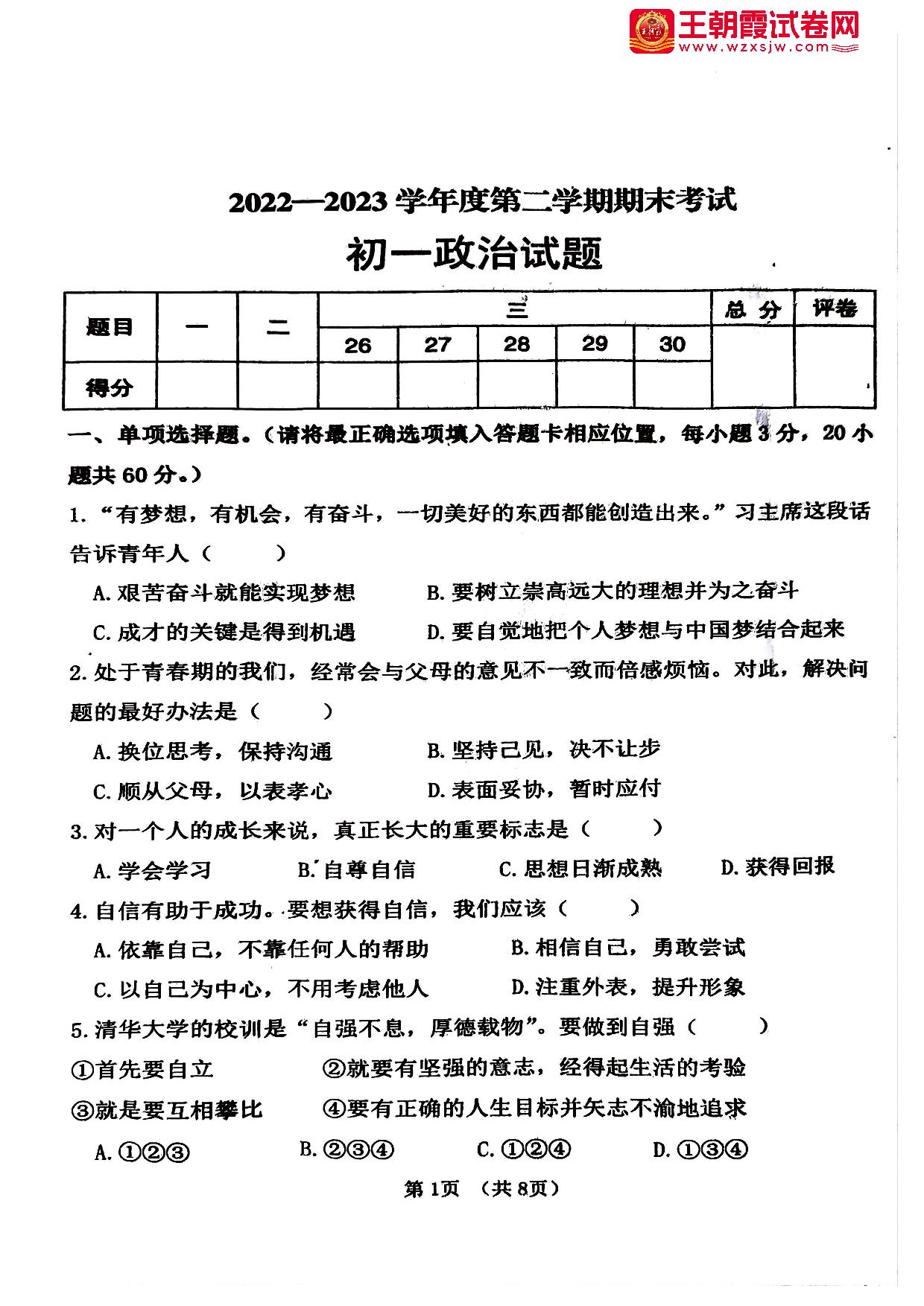 黑龙江省绥化市望奎县2022-2023学年度第二学期期末考试七年级道德与法治(人教版)【五四制】