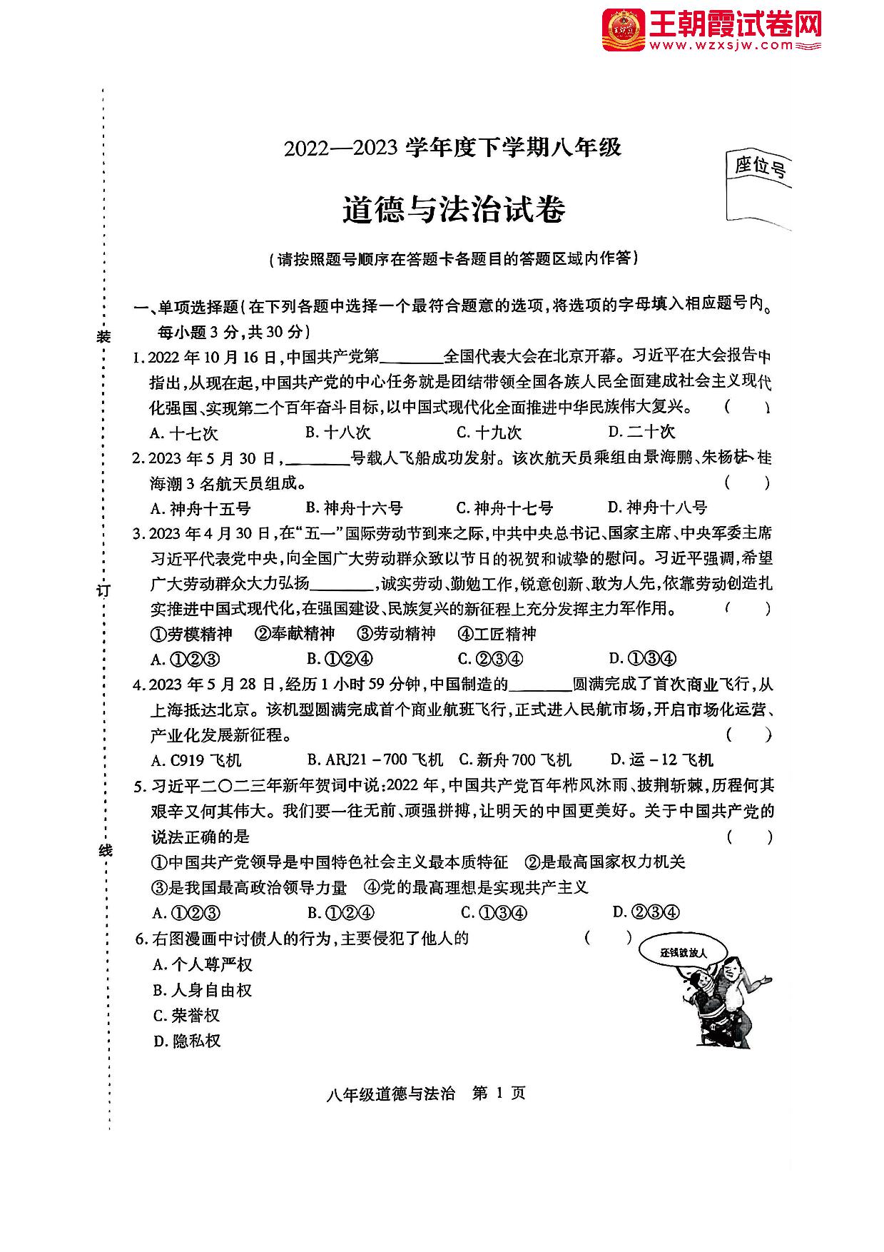 黑龙江省哈尔滨市南岗区2022-2023学年度下学期期末试卷八年级道德与法治(人教版)【五四制】