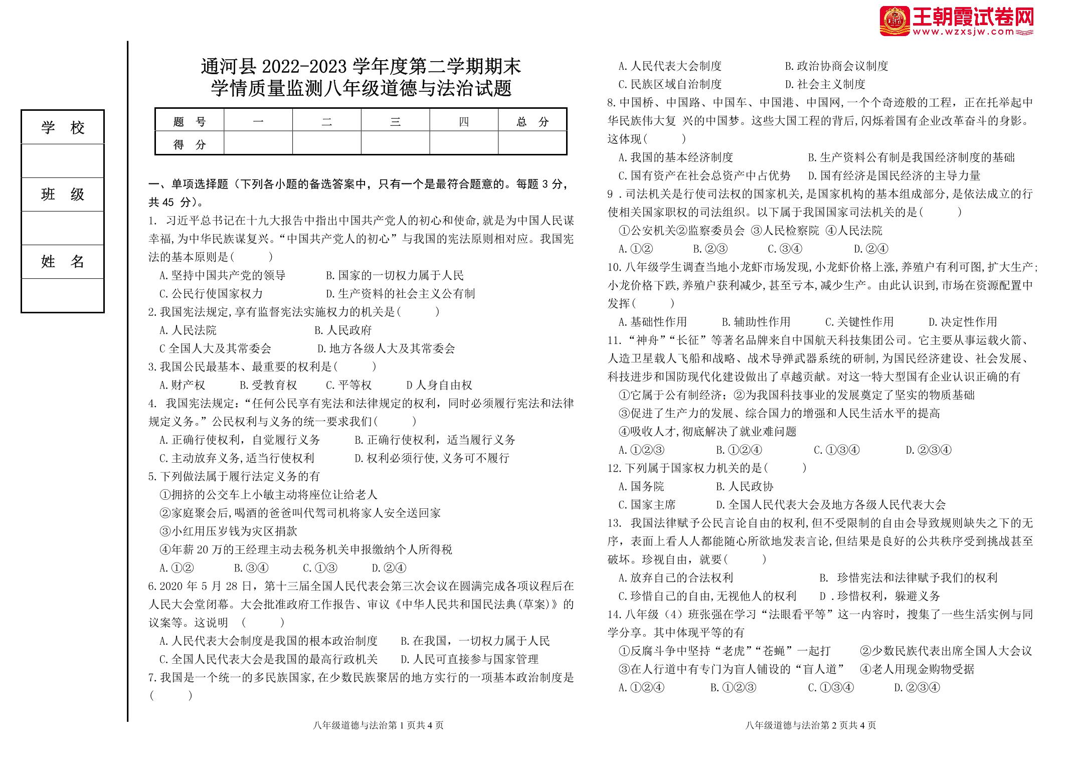 黑龙江省哈尔滨市通河县2022-2023学年度第二学期期末学情质量监测八年级道德与法治(人教版)