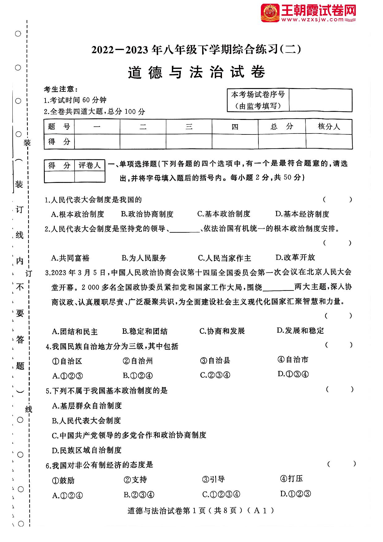黑龙江省双鸭山市2022-2023年下学期期末综合练习八年级道德与法治(人教版)
