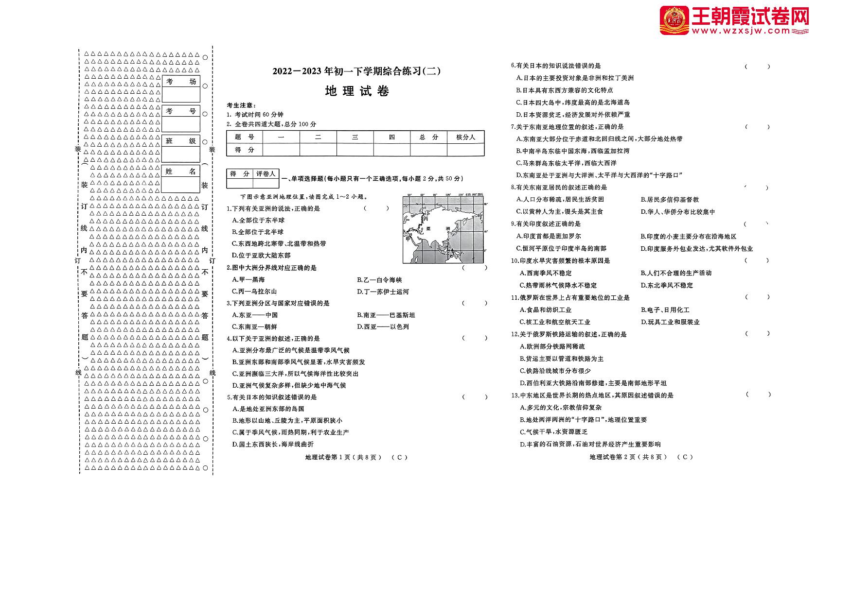 黑龙江省佳木斯市同江市东部六校联考2022-2023学年下学期期末综合练习七年级地理(人教版)
