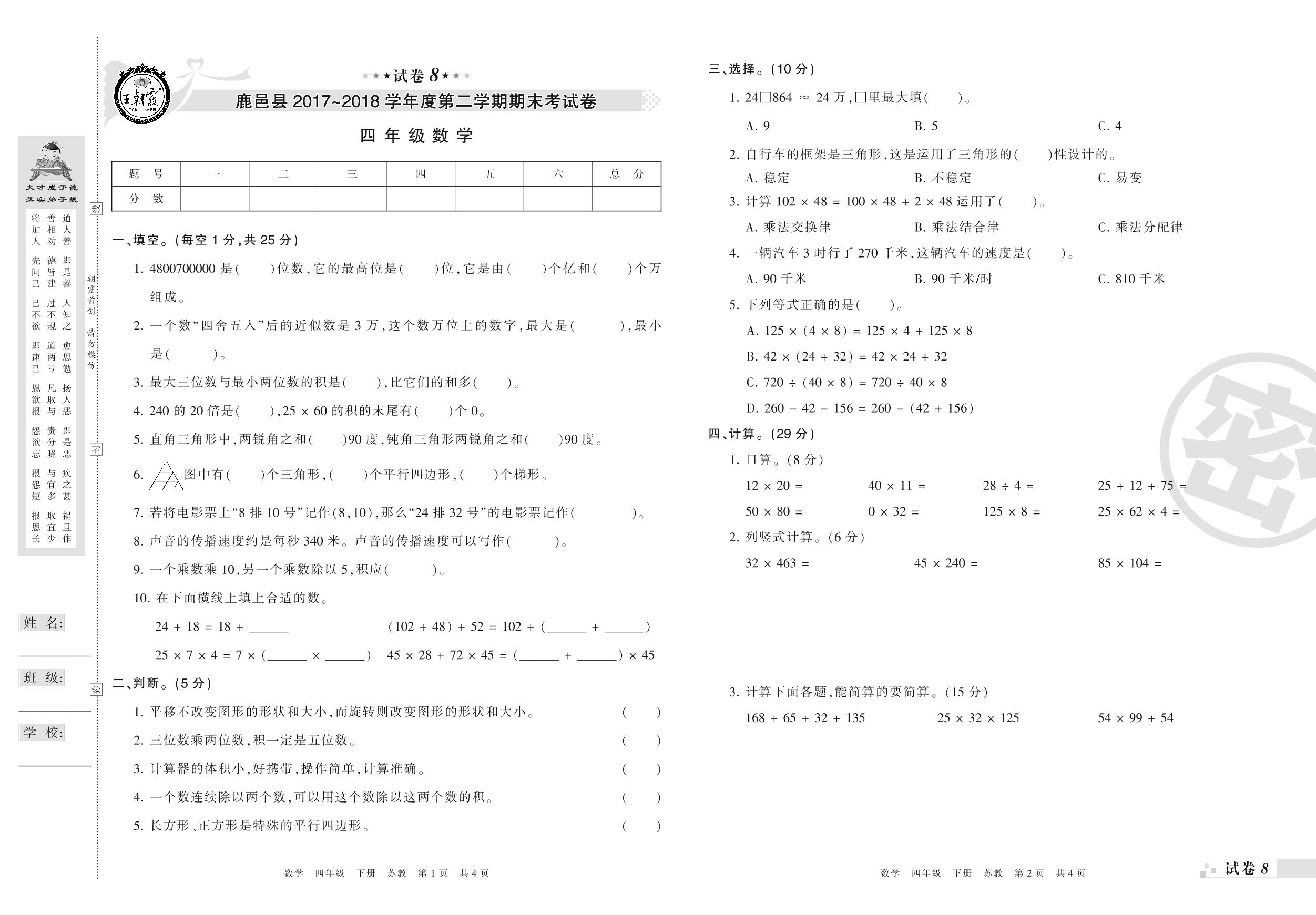 2017-2018学年第二学期周口市鹿邑县四年级数学试卷(苏教版)【8】