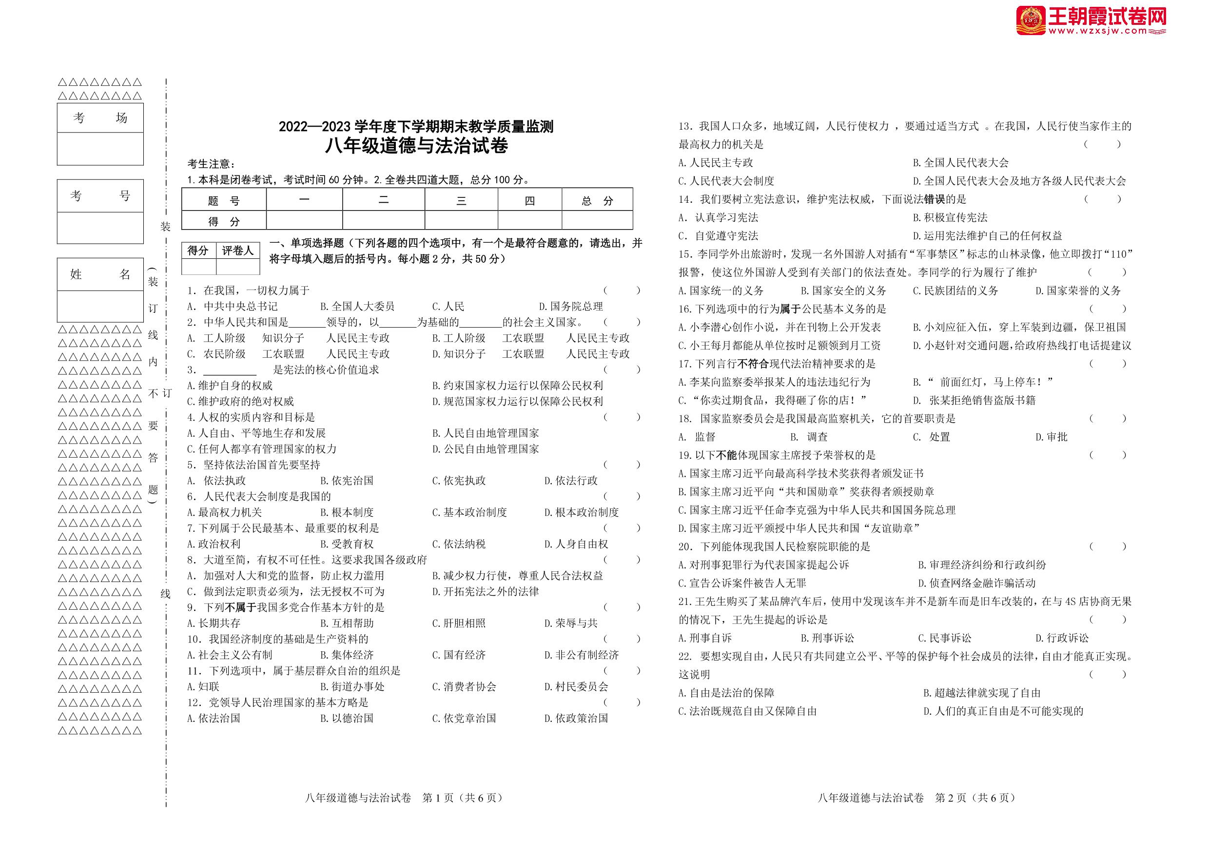 黑龙江省齐齐哈尔市梅里斯达斡尔族区2022-2023学年度下学期期末教学质量监测八年级道德与法治(人教版)