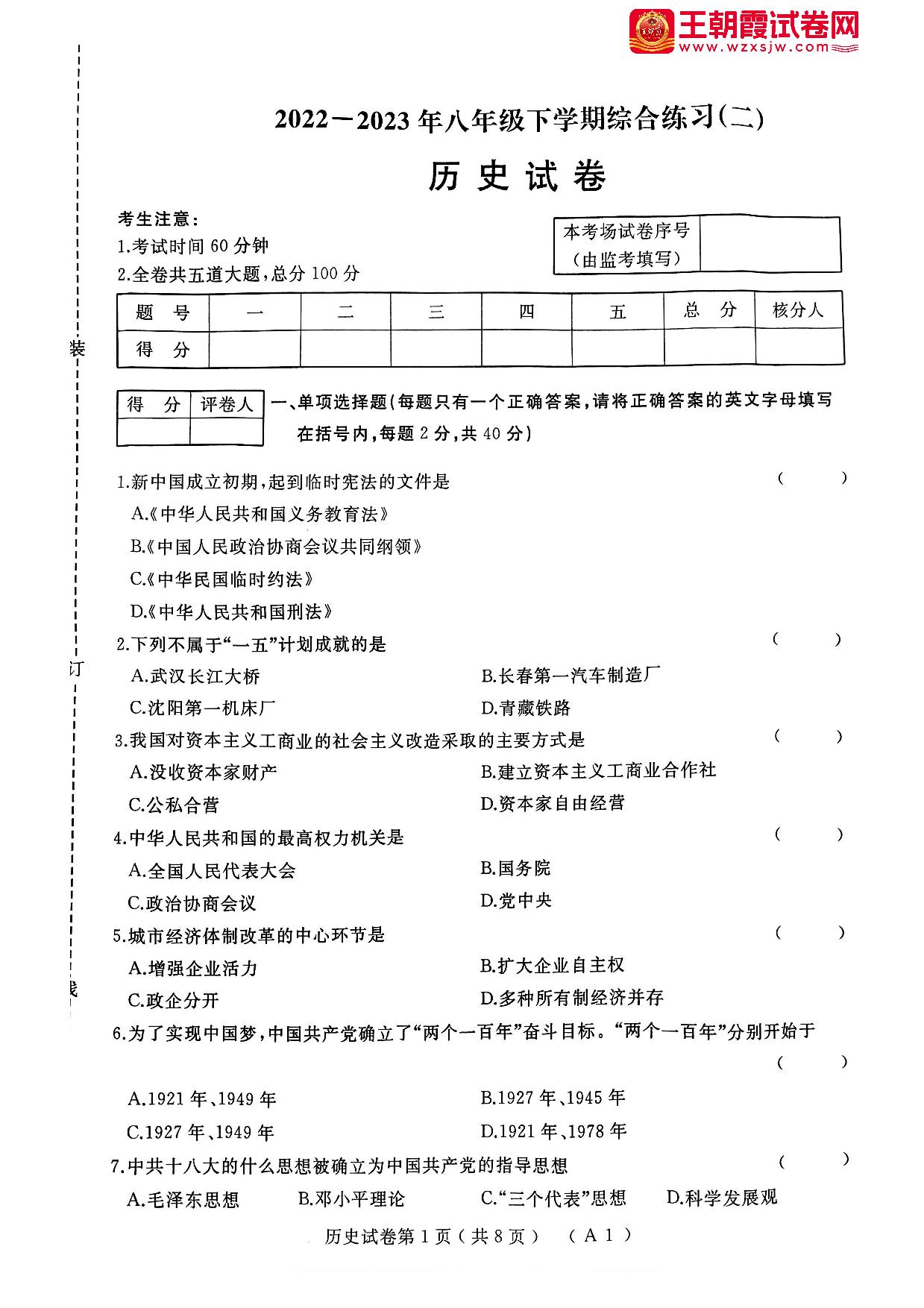 黑龙江省双鸭山市2022-2023年下学期期末综合练习八年级历史(人教版)