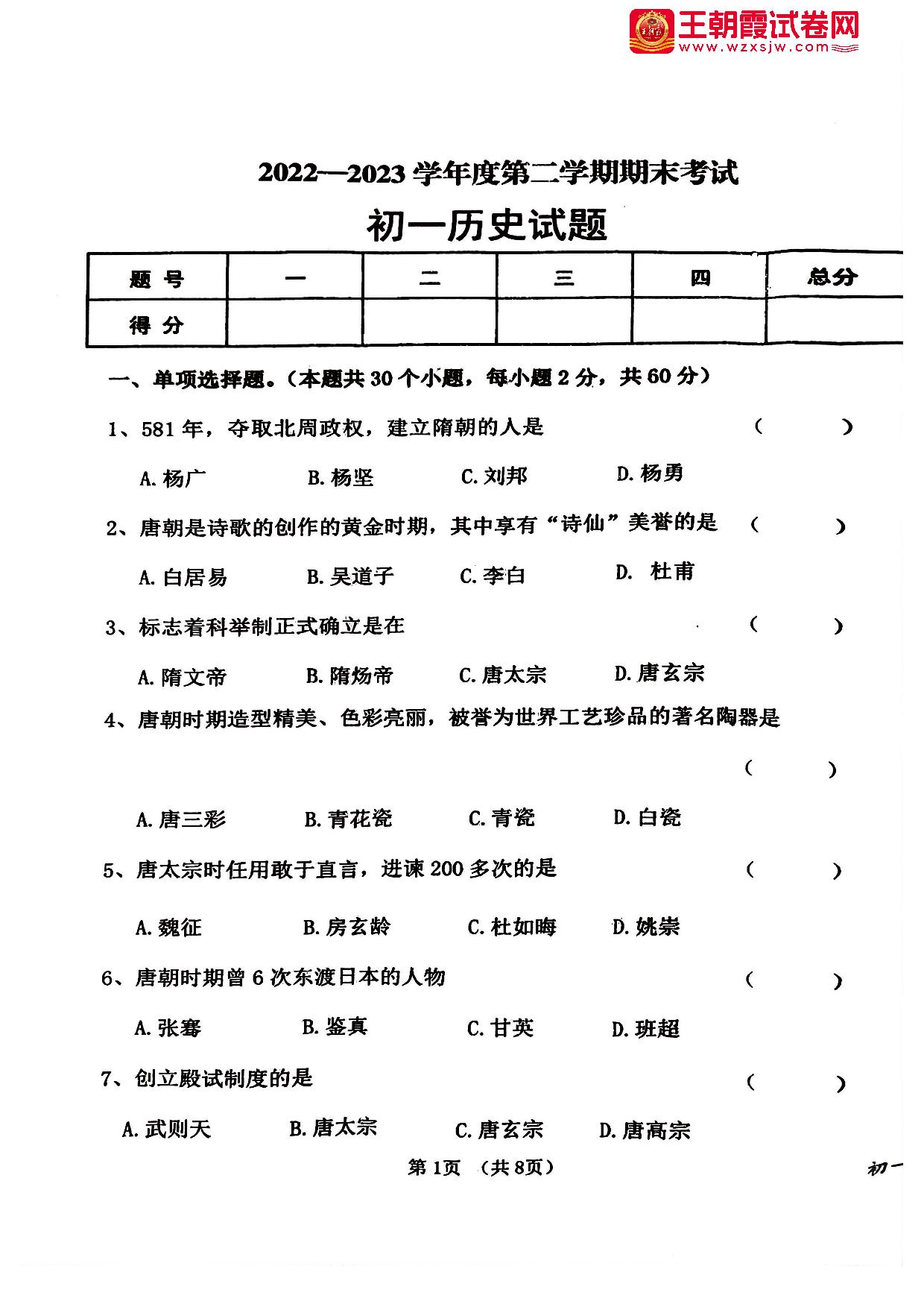 七年级历史人教版下册期末卷