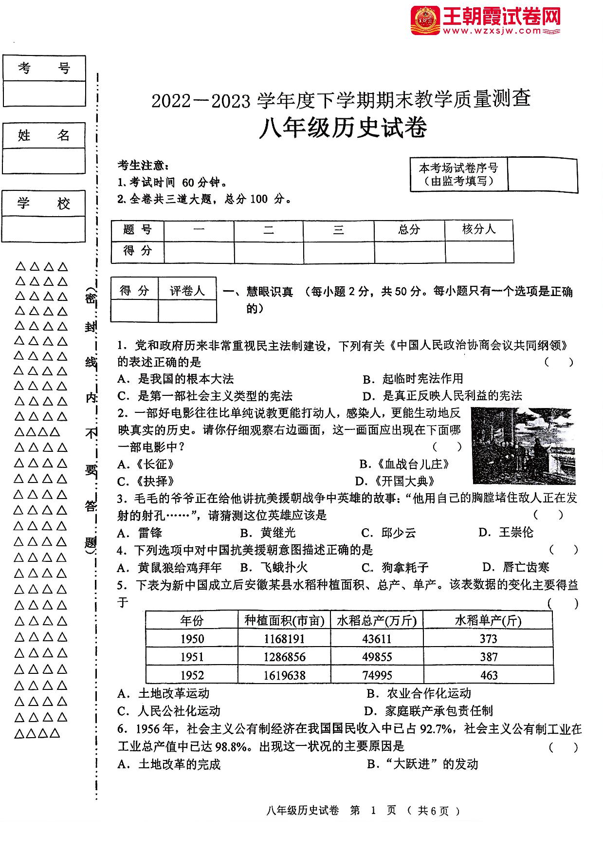黑龙江省齐齐哈尔市龙江县2022-2023学年度下学期期末教学质量测查八年级历史(人教版)【五四制】