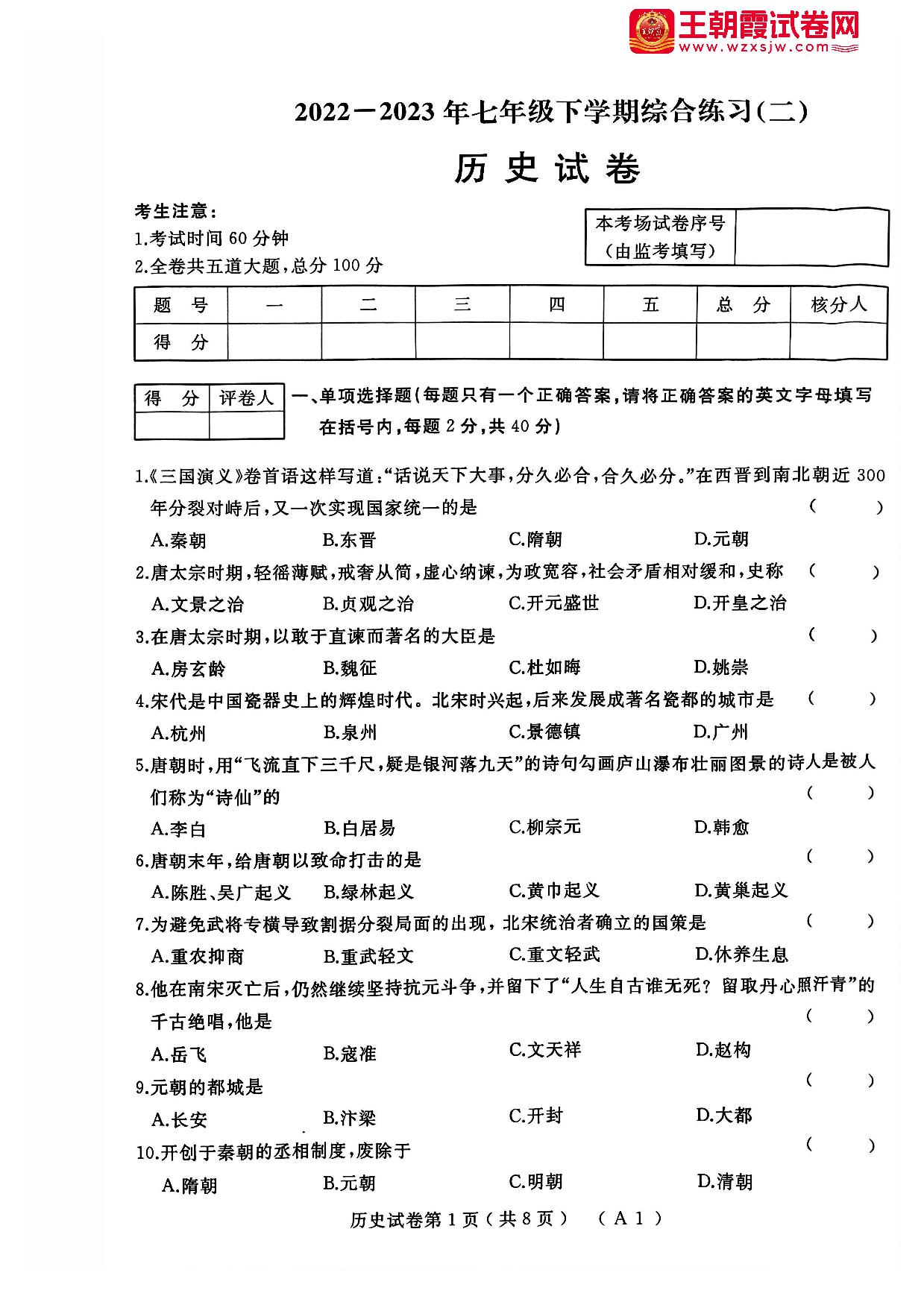 黑龙江省双鸭山市2022-2023年下学期期末综合练习七年级历史(人教版)