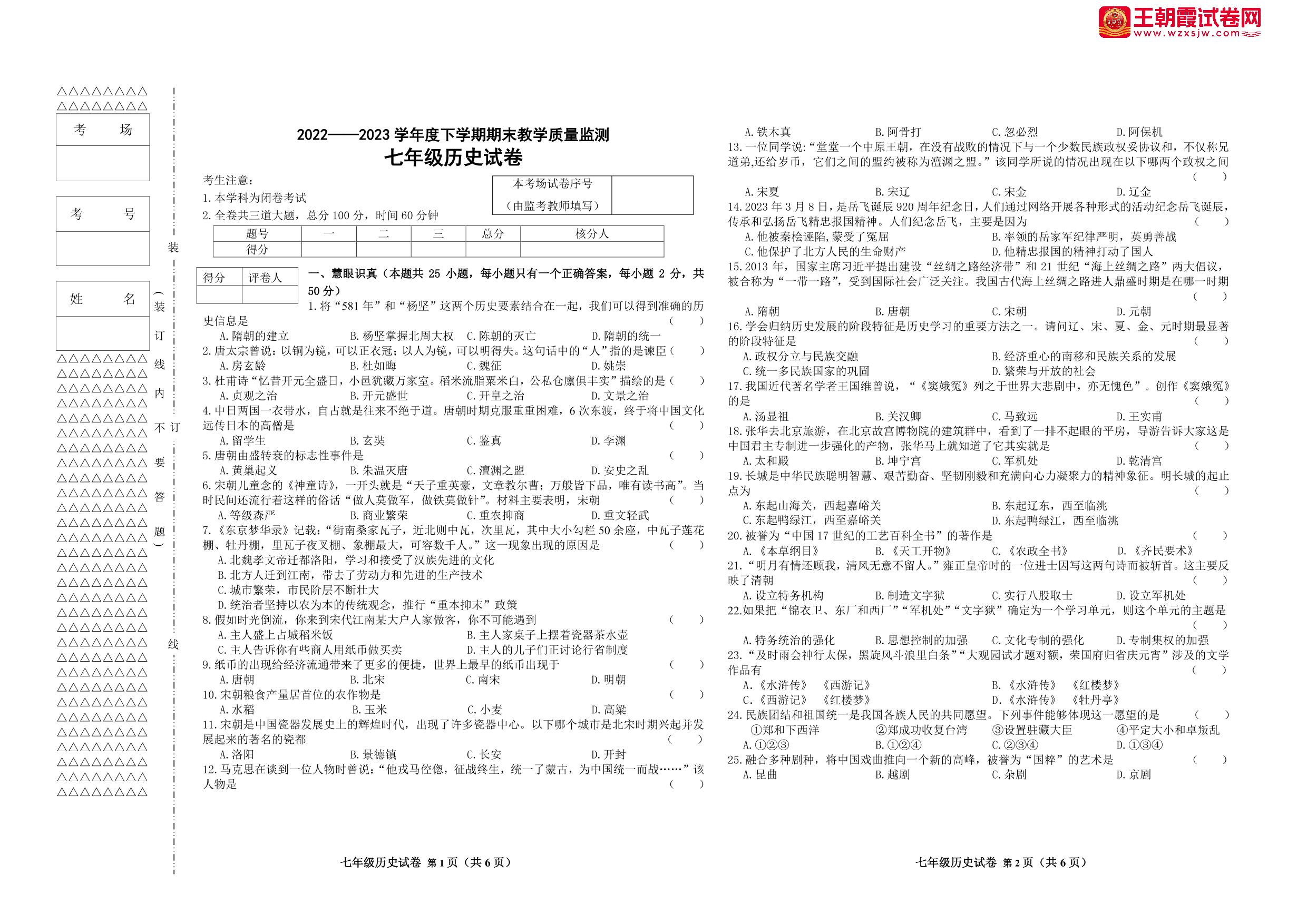 黑龙江省齐齐哈尔市梅里斯达斡尔族区2022-2023学年度下学期期末教学质量监测七年级历史(人教版)