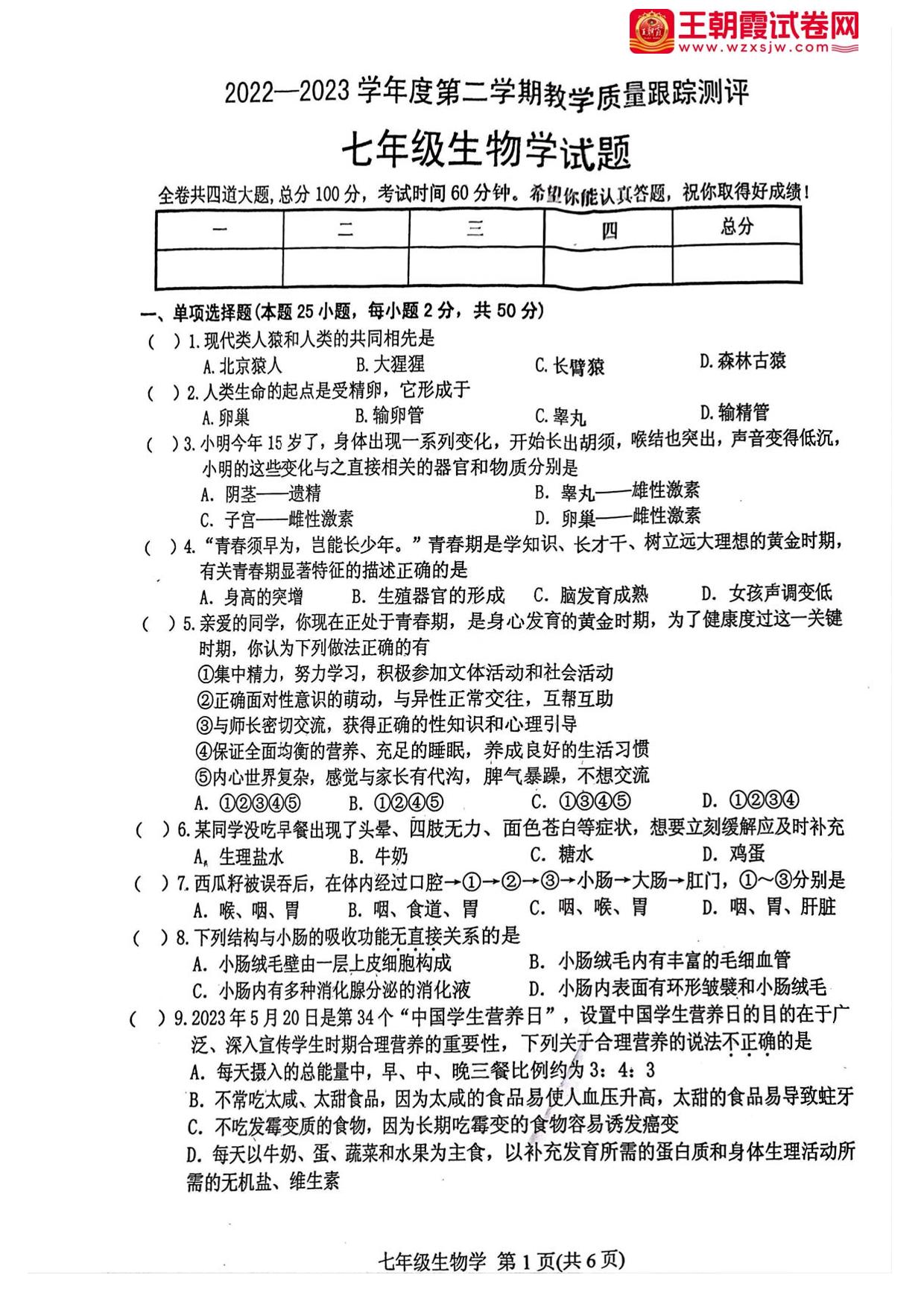 黑龙江省牡丹江市海林市2022-2023学年度第二学期教学质量跟踪测评七年级生物(人教版)