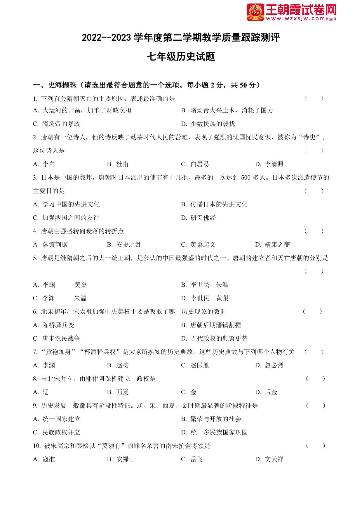 黑龙江省牡丹江市海林市2022-2023学年度第二学期教学质量跟踪测评七年级历史(人教版)