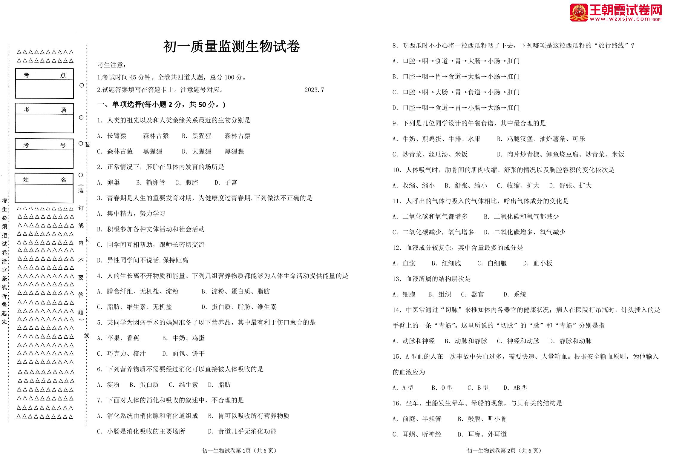 黑龙江省齐齐哈尔市铁锋区2022-2023学年下学期期末质量监测七年级生物(人教版)
