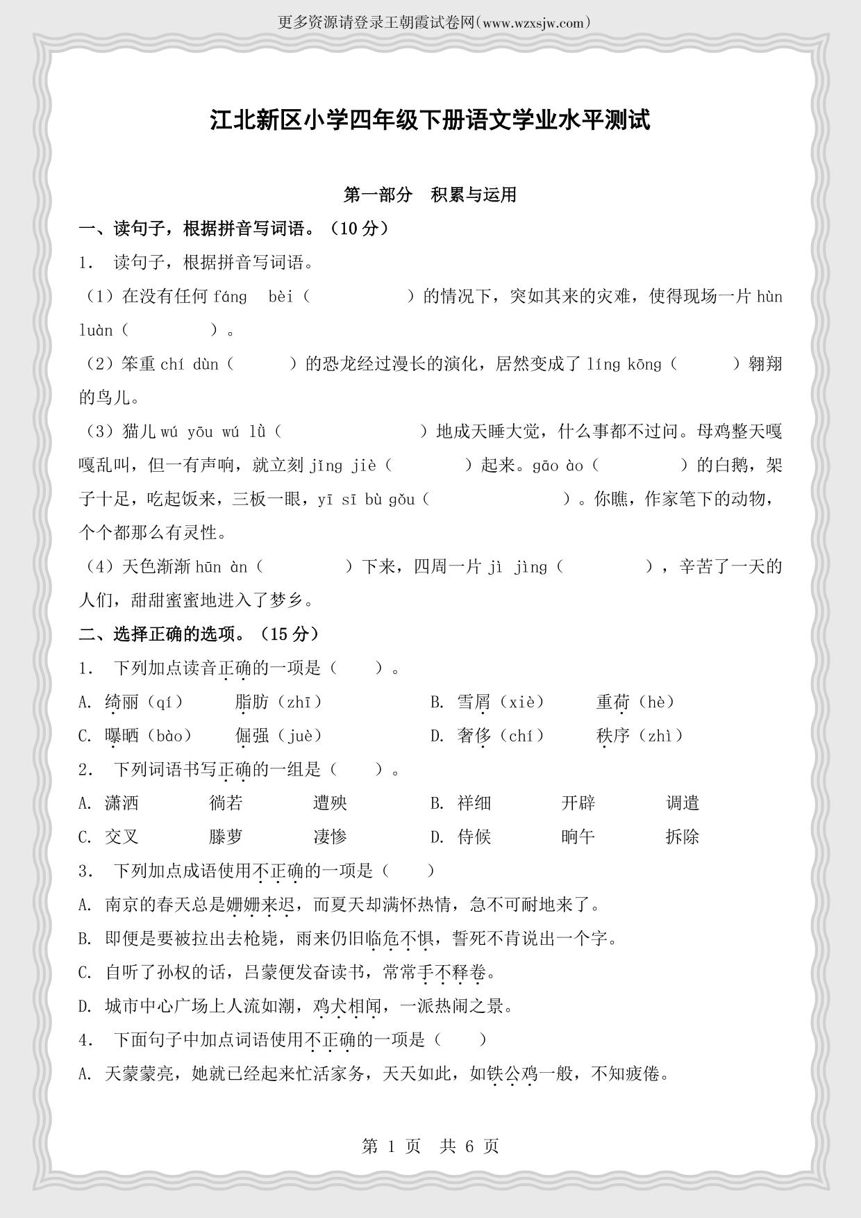 江苏省南京市江北新区2022-2023学年第二学期期末学业水平测试四年级语文(人教版)