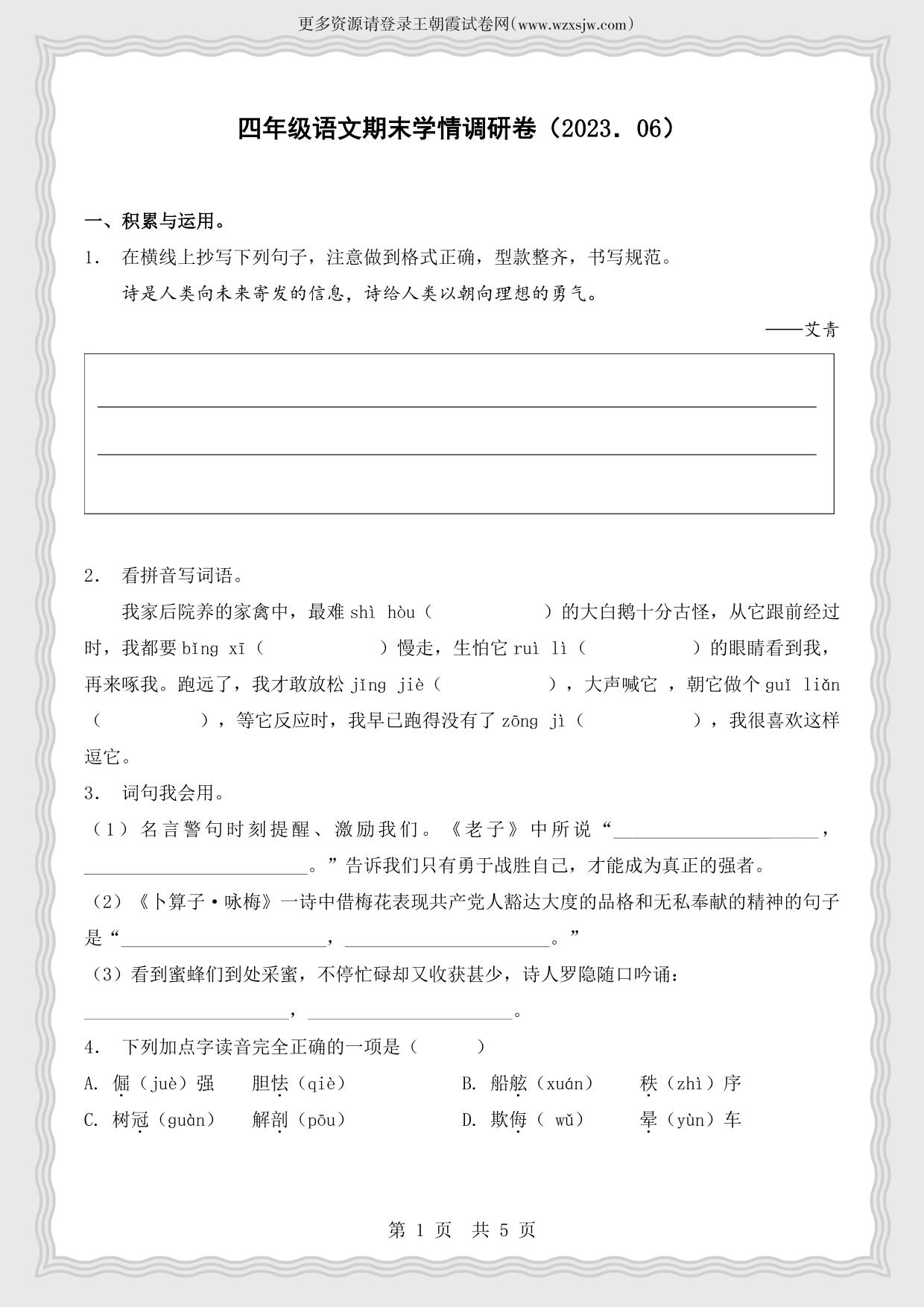 江苏省徐州经济技术开发区十校联考2022-2023学年第二学期期末考试试卷四年级语文(人教版)