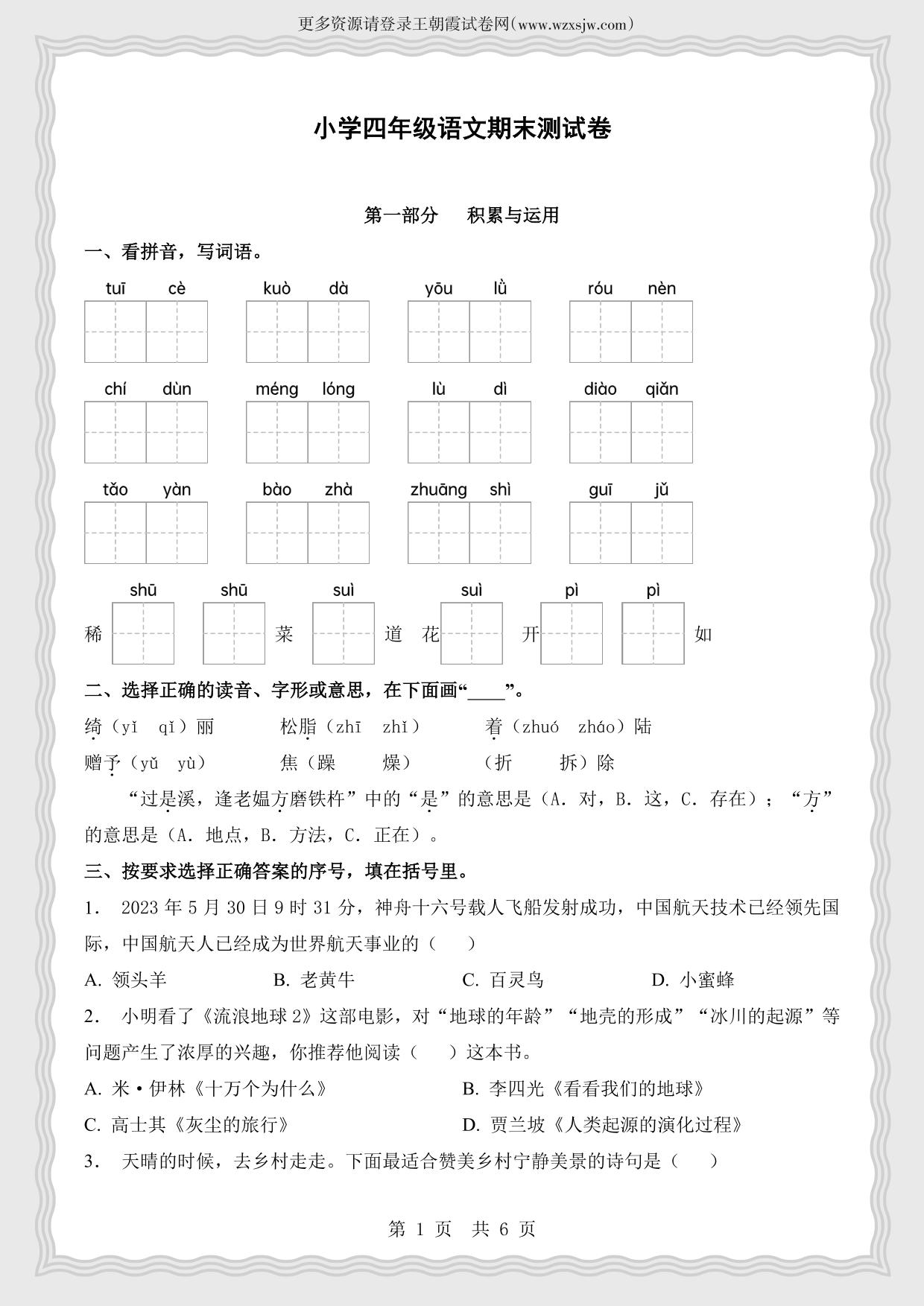 江苏省南京市鼓楼区2022-2023学年第二学期期末考试试卷四年级语文(人教版)