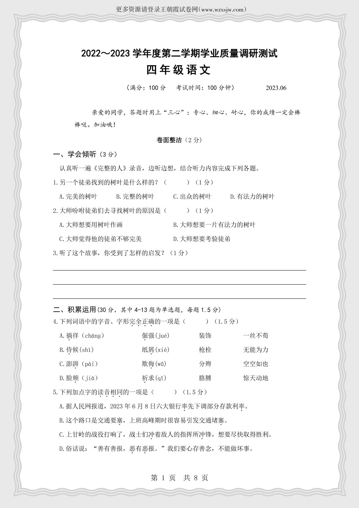 江苏省扬州市高邮市2022-2023学年下学期期末试卷四年级语文(人教版)