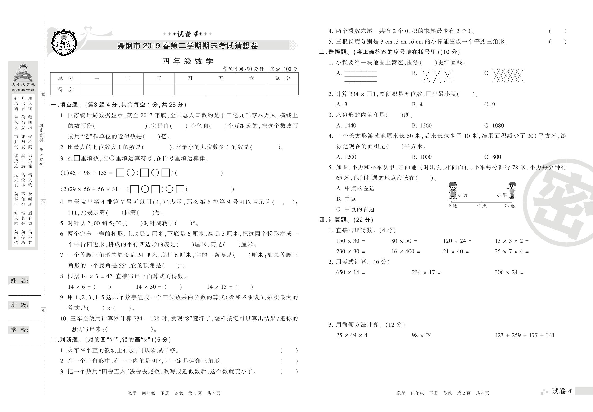 2018-2019学年第二学期舞钢市猜想卷四年级数学试卷(苏教版)【4】