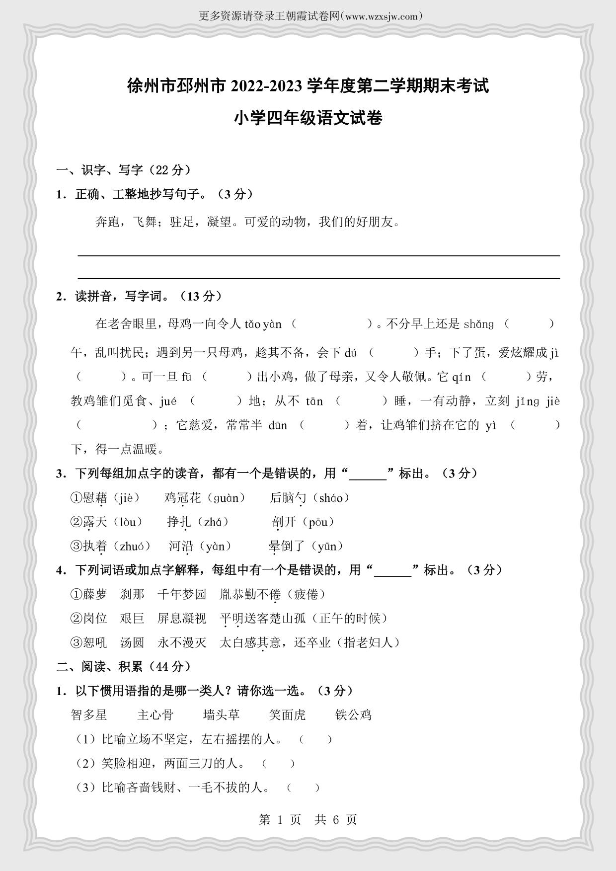 江苏省徐州市邳州市2022-2023学年第二学期期末试卷四年级语文(人教版)