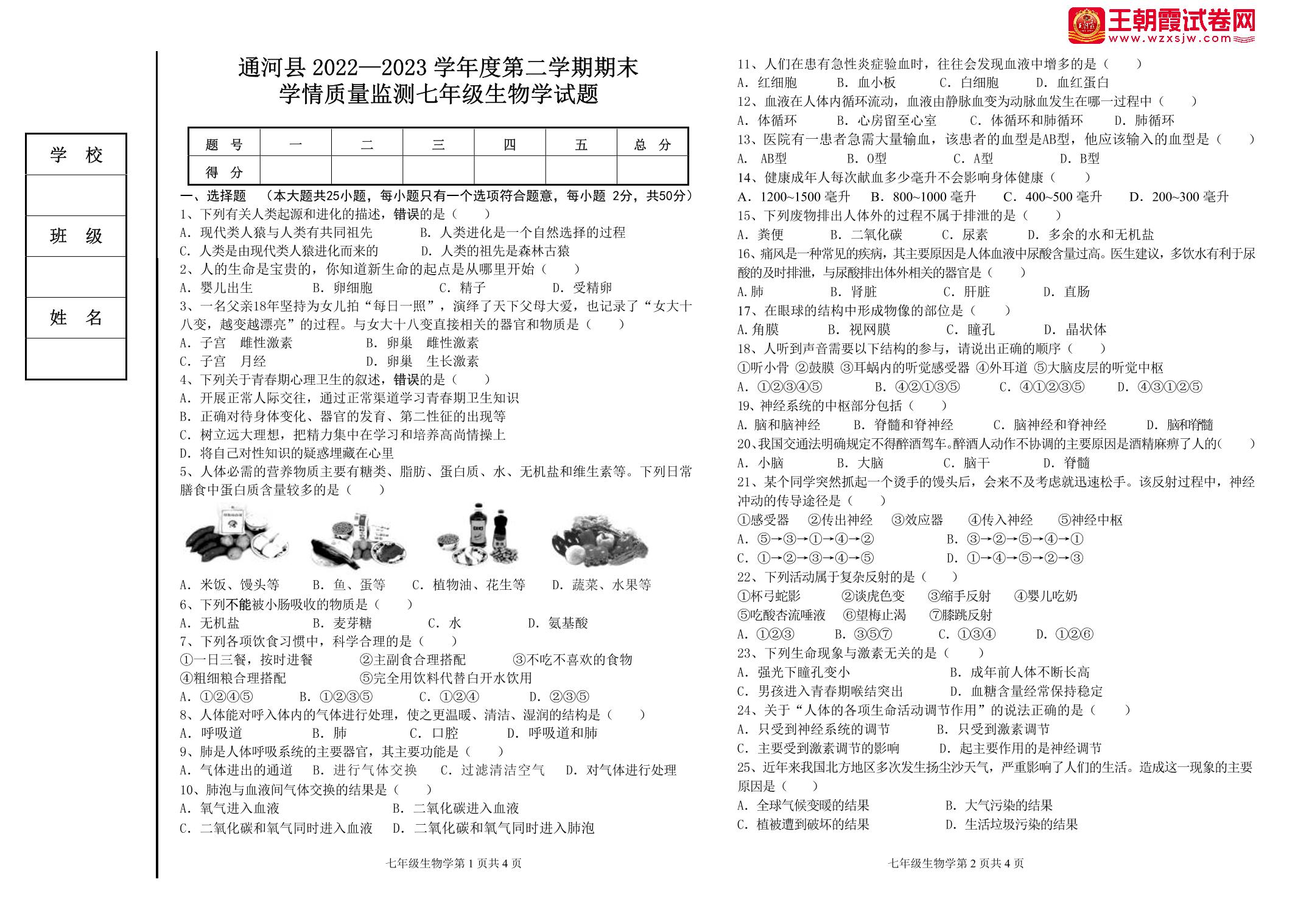 七年级生物人教版下册期末卷