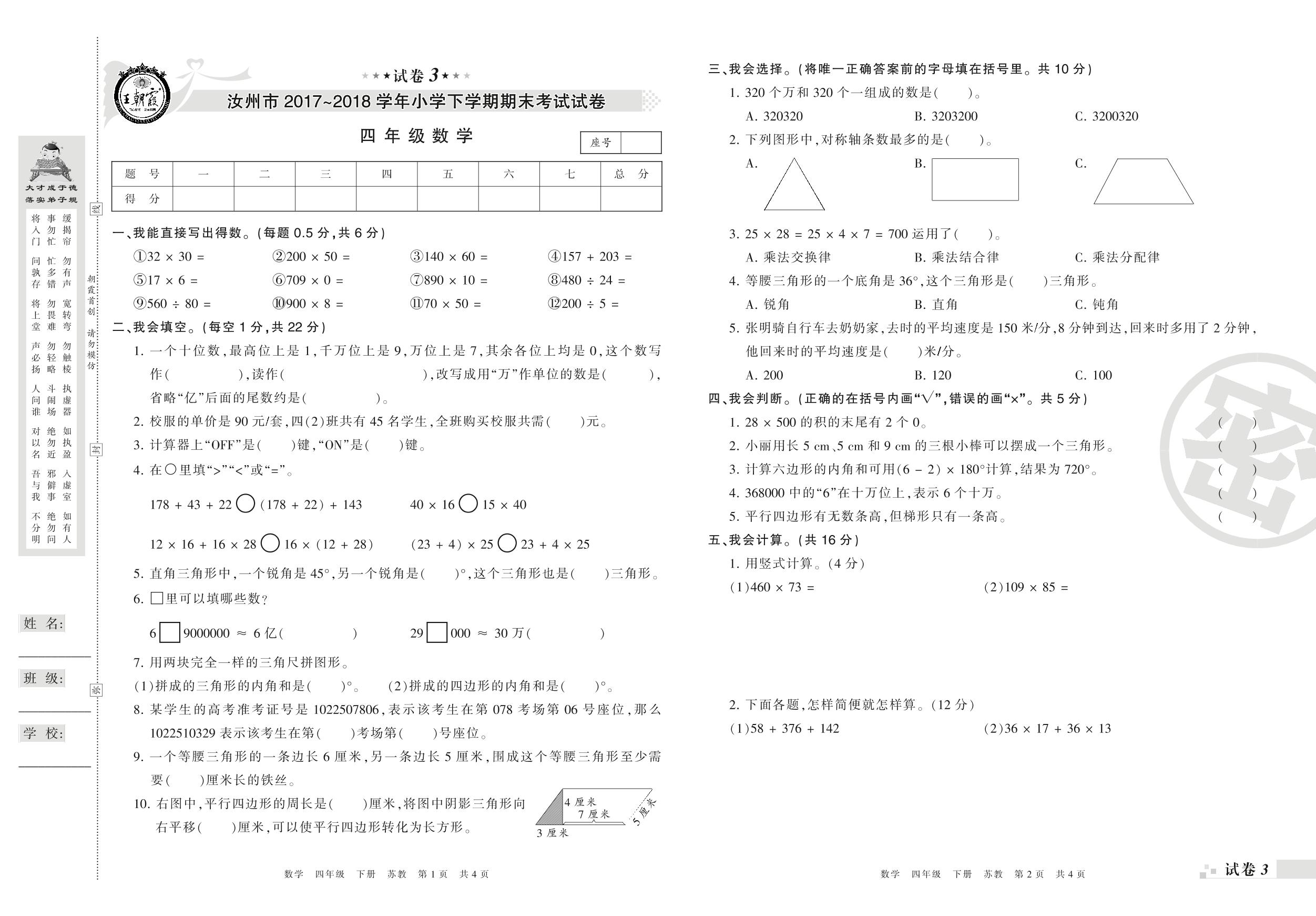 2017-2018学年第二学期汝州市四年级数学试卷(苏教版)【3】