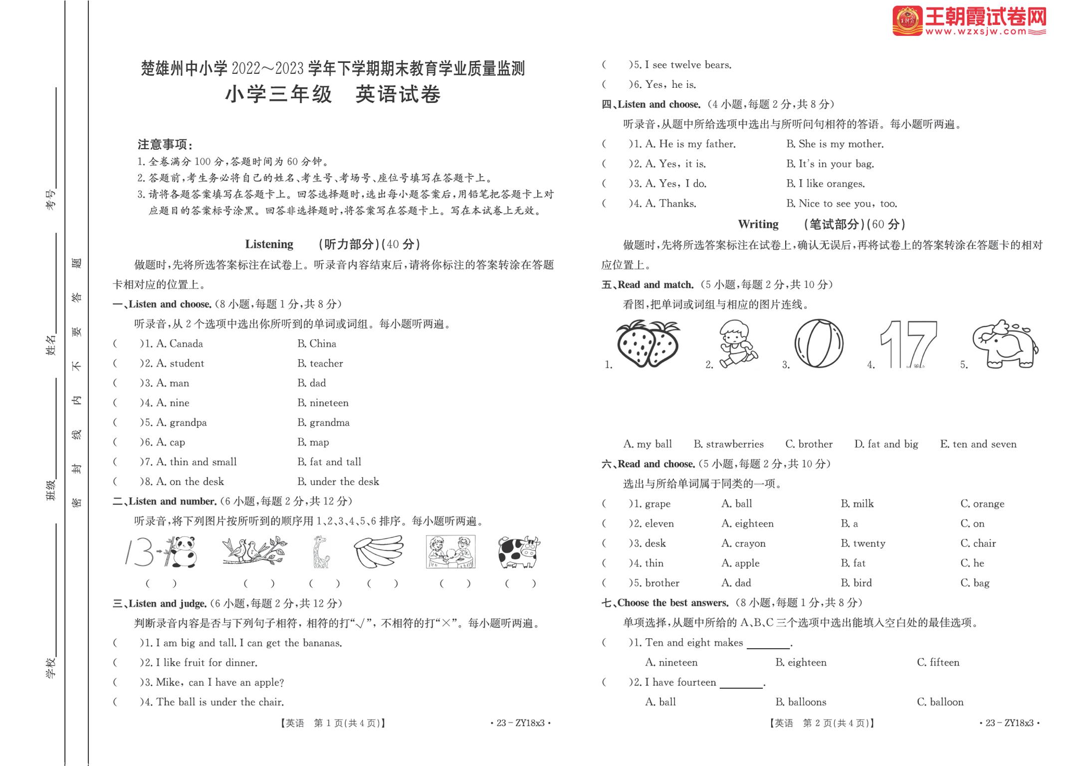 云南省楚雄彝族自治州2022-2023学年下学期期末教育学业质量监测试卷三年级英语(人教PEP版)