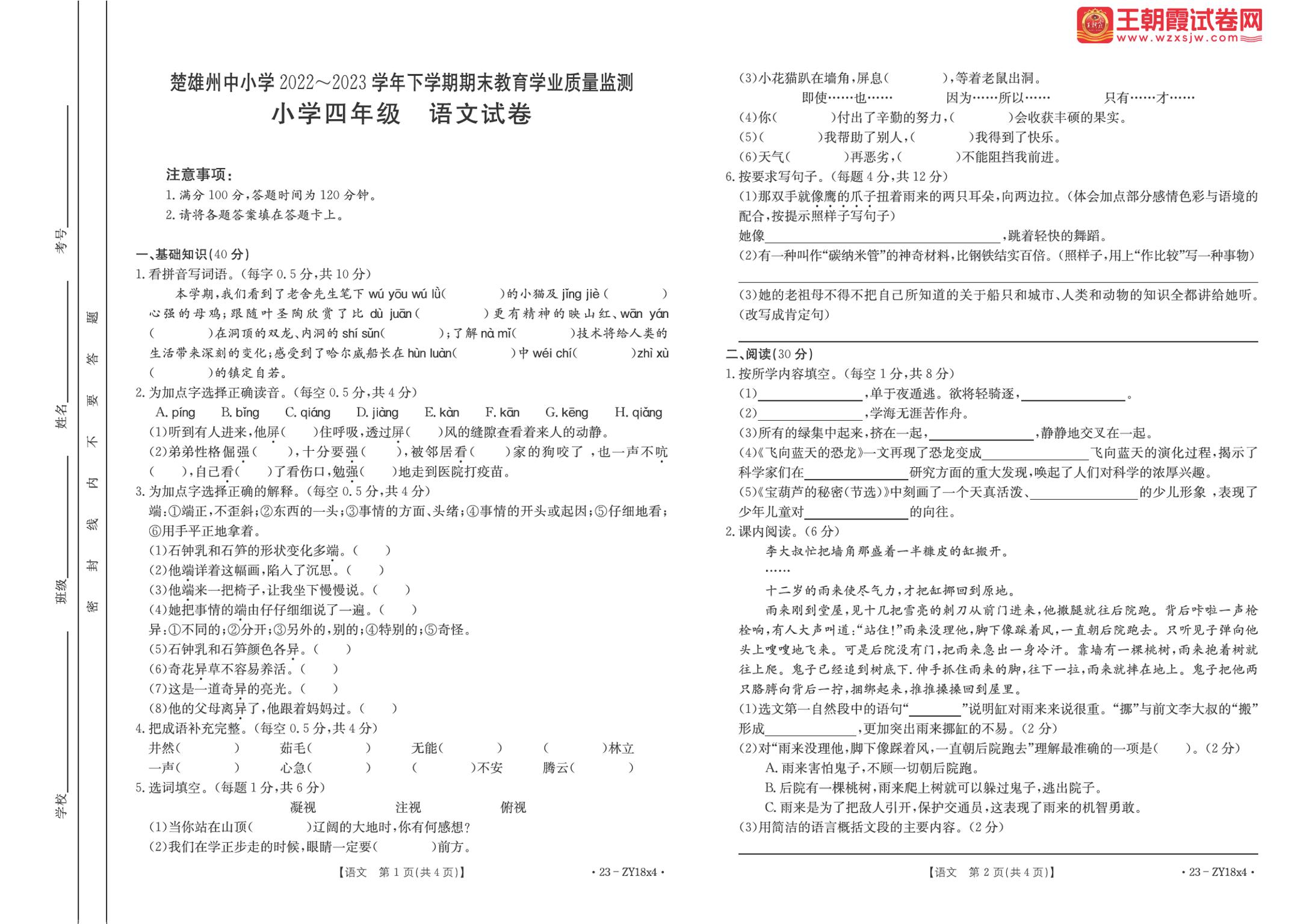 云南省楚雄彝族自治州2022-2023学年下学期期末教育学业质量监测试卷四年级语文(人教版)