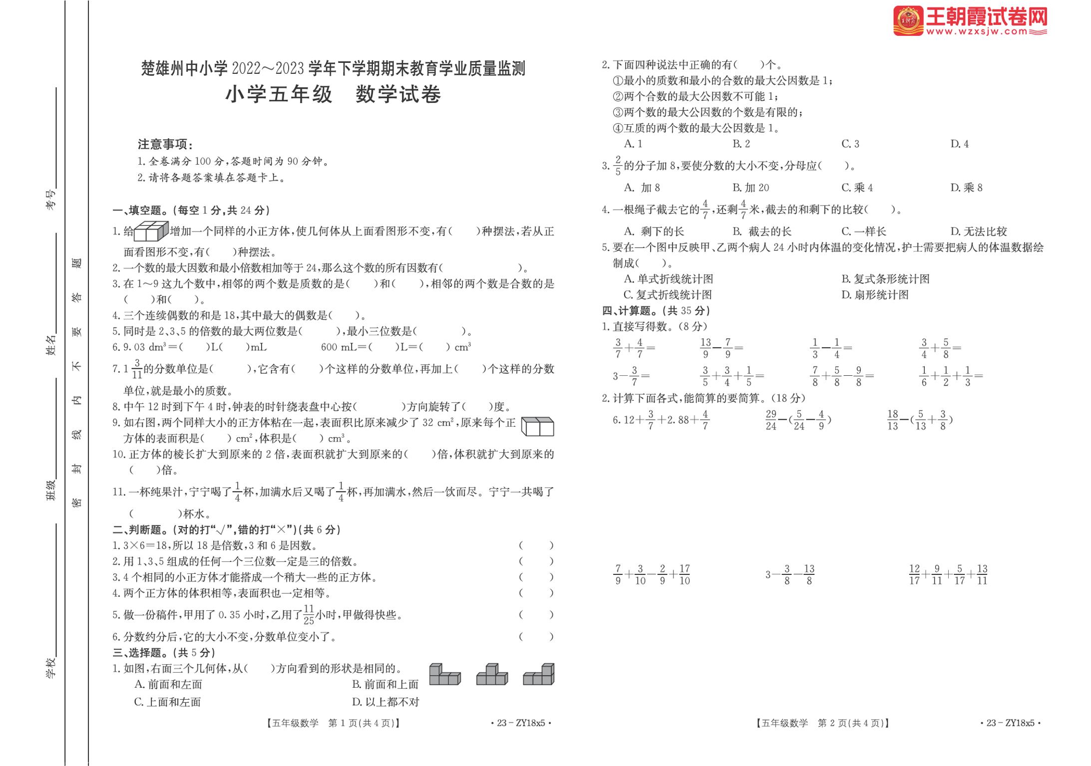 云南省楚雄彝族自治州2022-2023学年下学期期末教育学业质量监测试卷五年级数学(人教版)