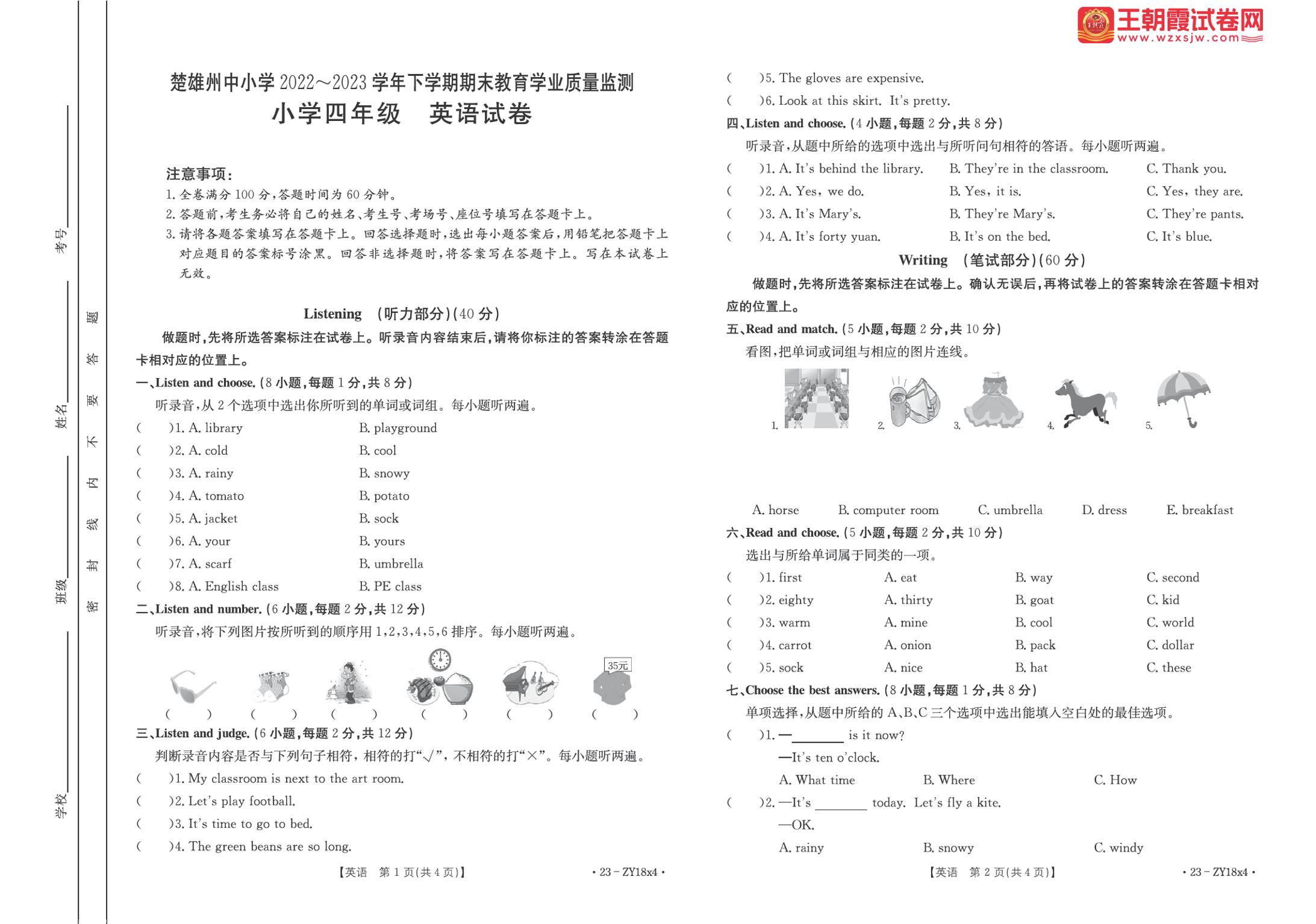 云南省楚雄彝族自治州2022-2023学年下学期期末教育学业质量监测试卷四年级英语(人教PEP版)