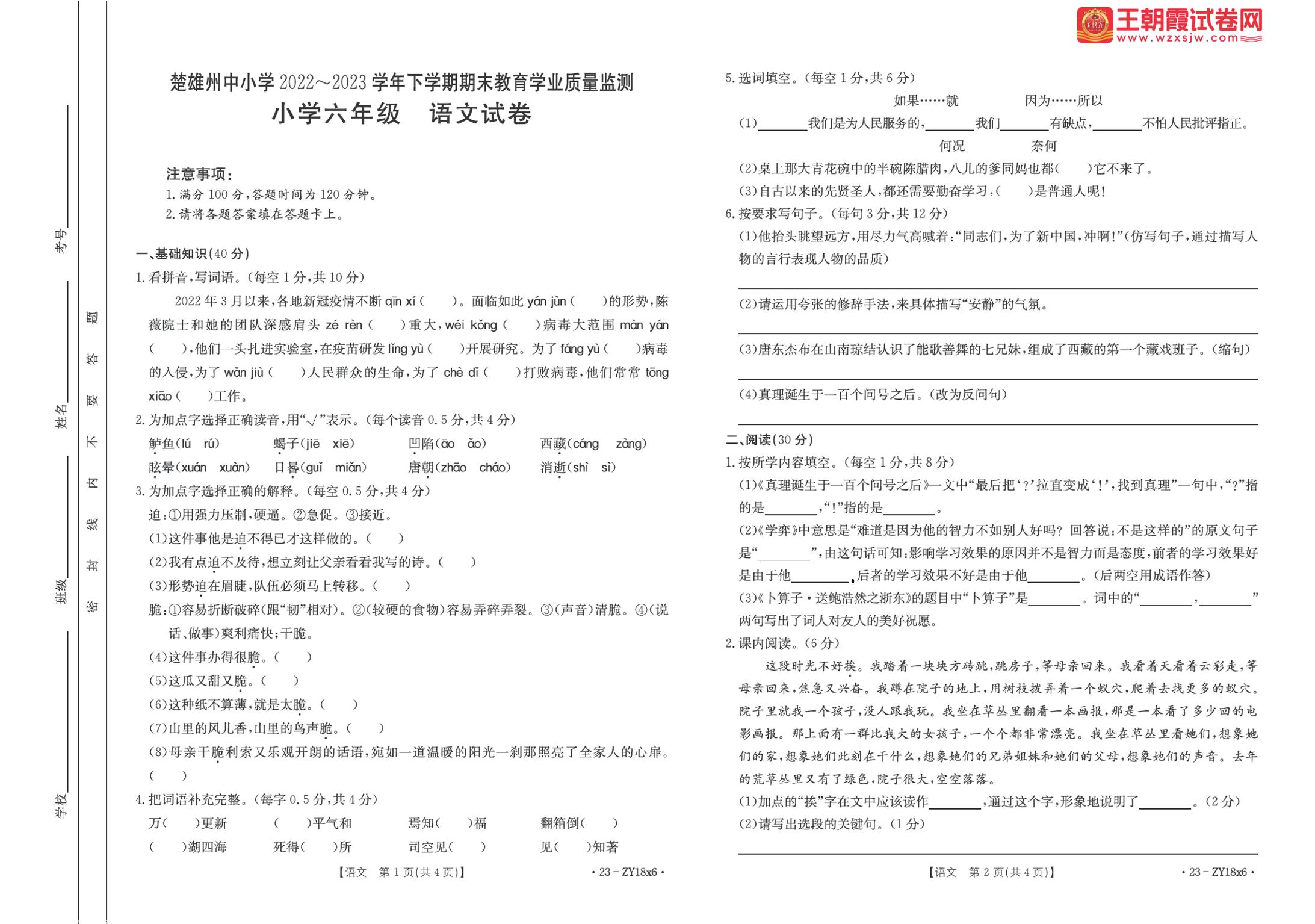 云南省楚雄彝族自治州2022-2023学年下学期期末教育学业质量监测试卷六年级语文(人教版)