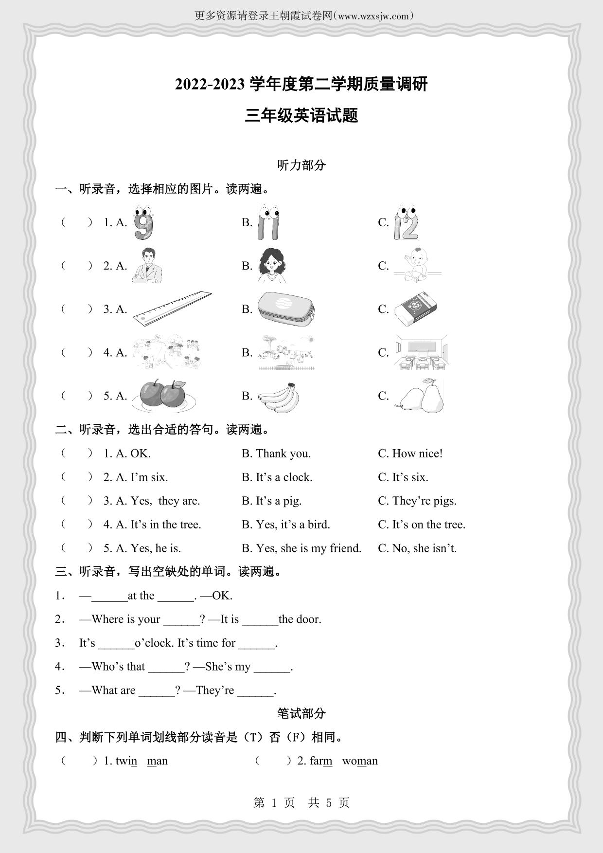 江苏省徐州市沛县2022-2023学年第二学期期末质量调研三年级英语(译林版)【无听力音频】