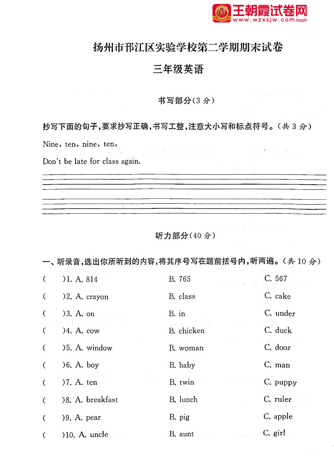 江苏省扬州市邗江区实验学校2022-2023学年第二学期期末试卷三年级英语(译林版)【无听力音频】
