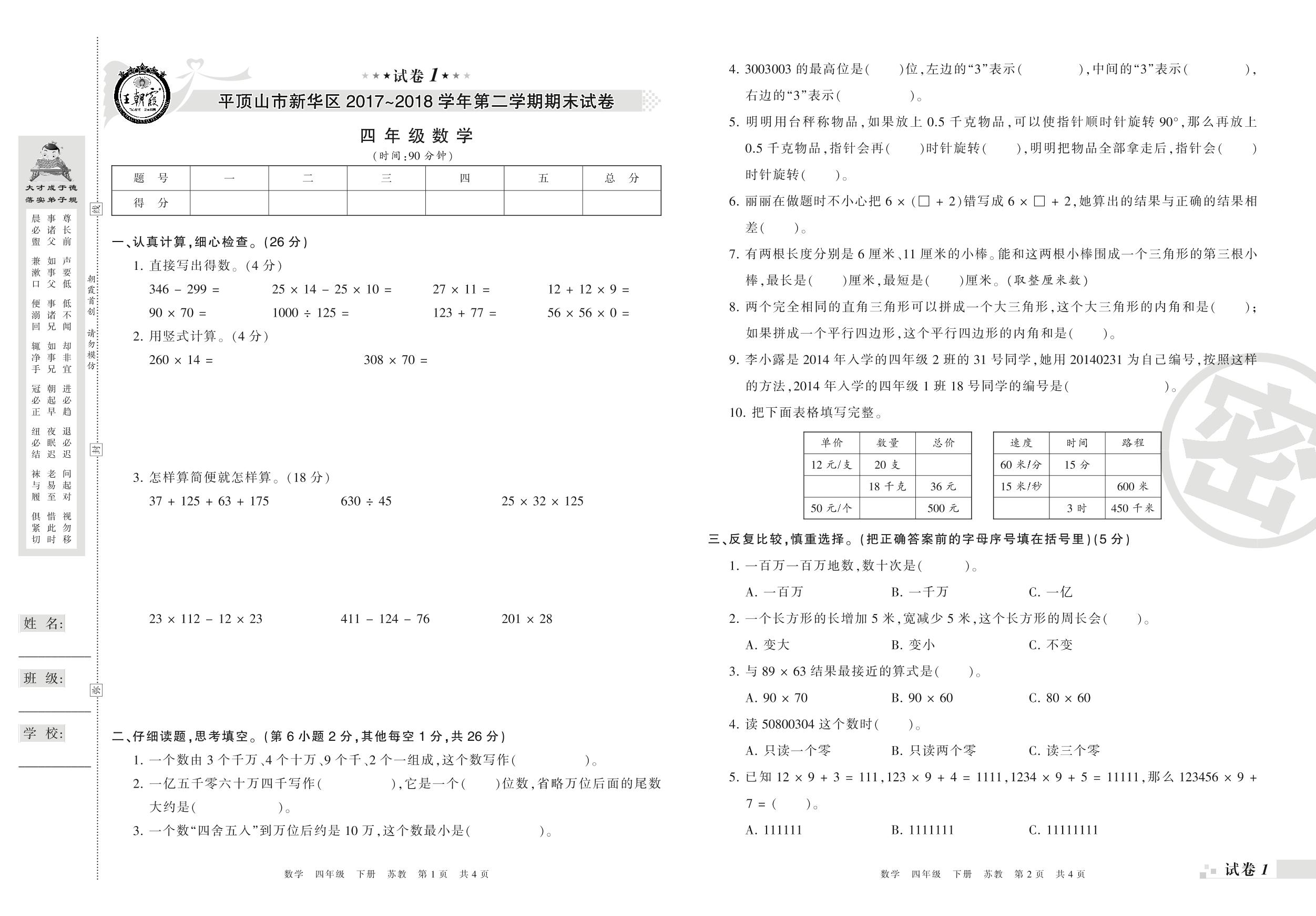 2017-2018学年第二学期平顶山市新华区四年级数学试卷(苏教版)_R210804145936【1】