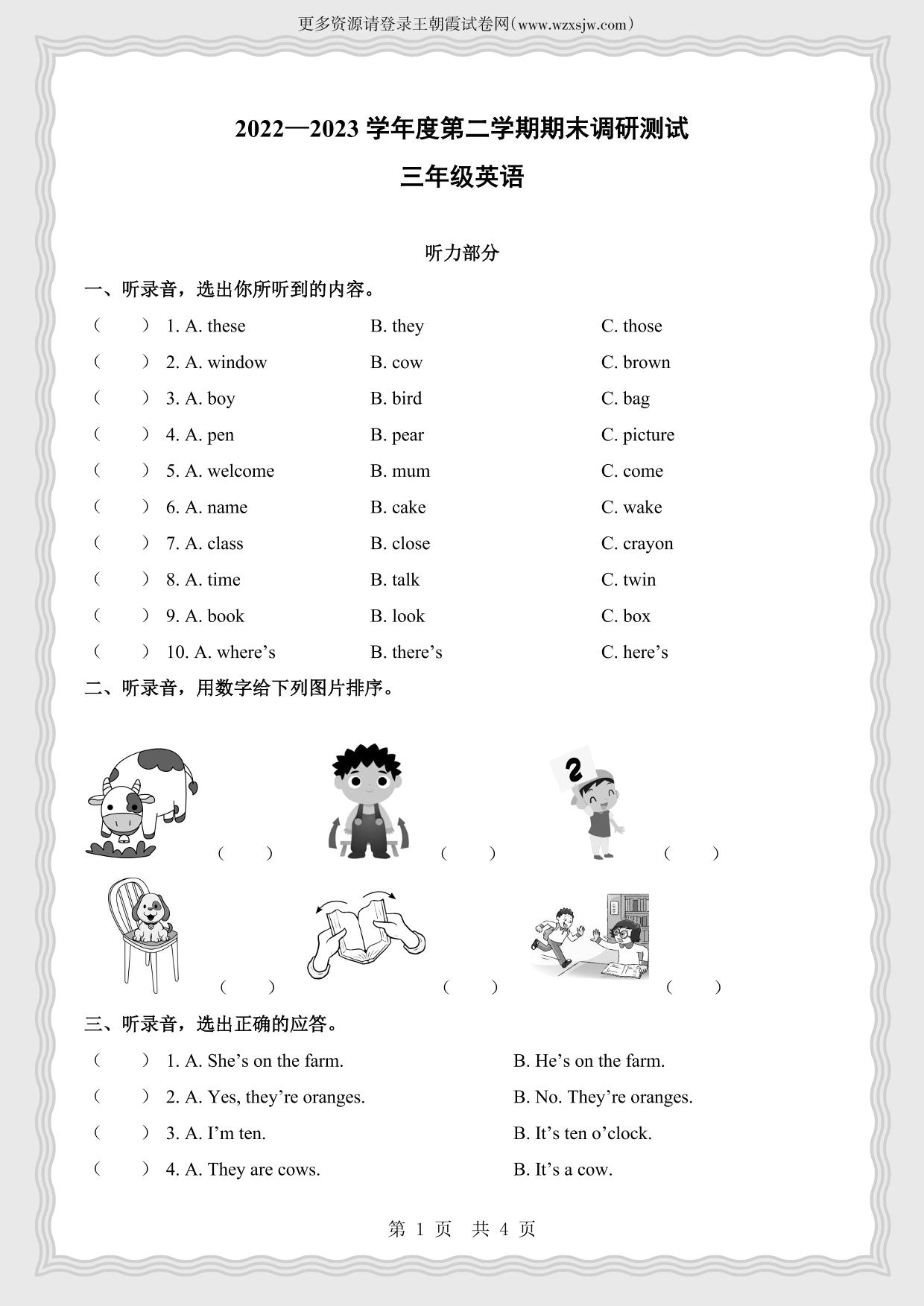 三年级英语译林版(译林牛津版)下册期末卷