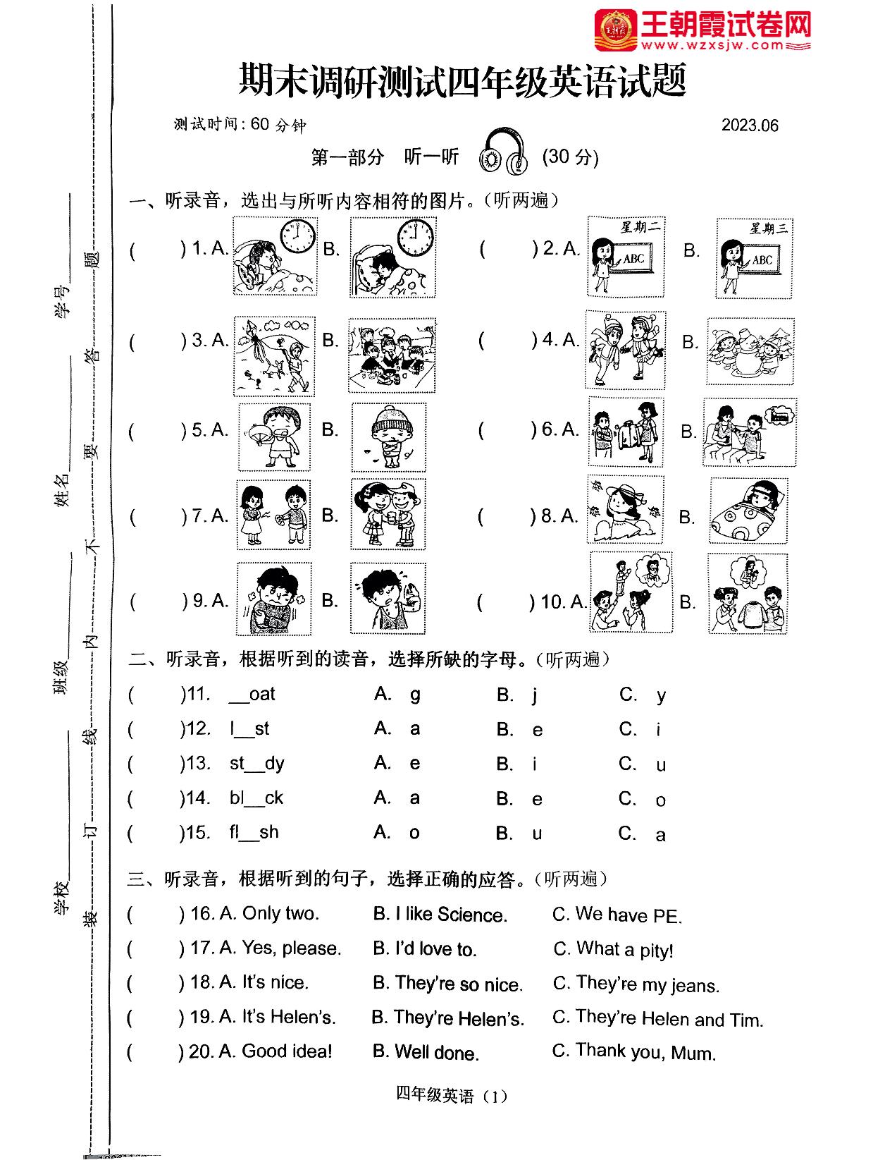 江苏省常州市溧阳市2022-2023学年第二学期期末调研测试四年级英语(译林版)