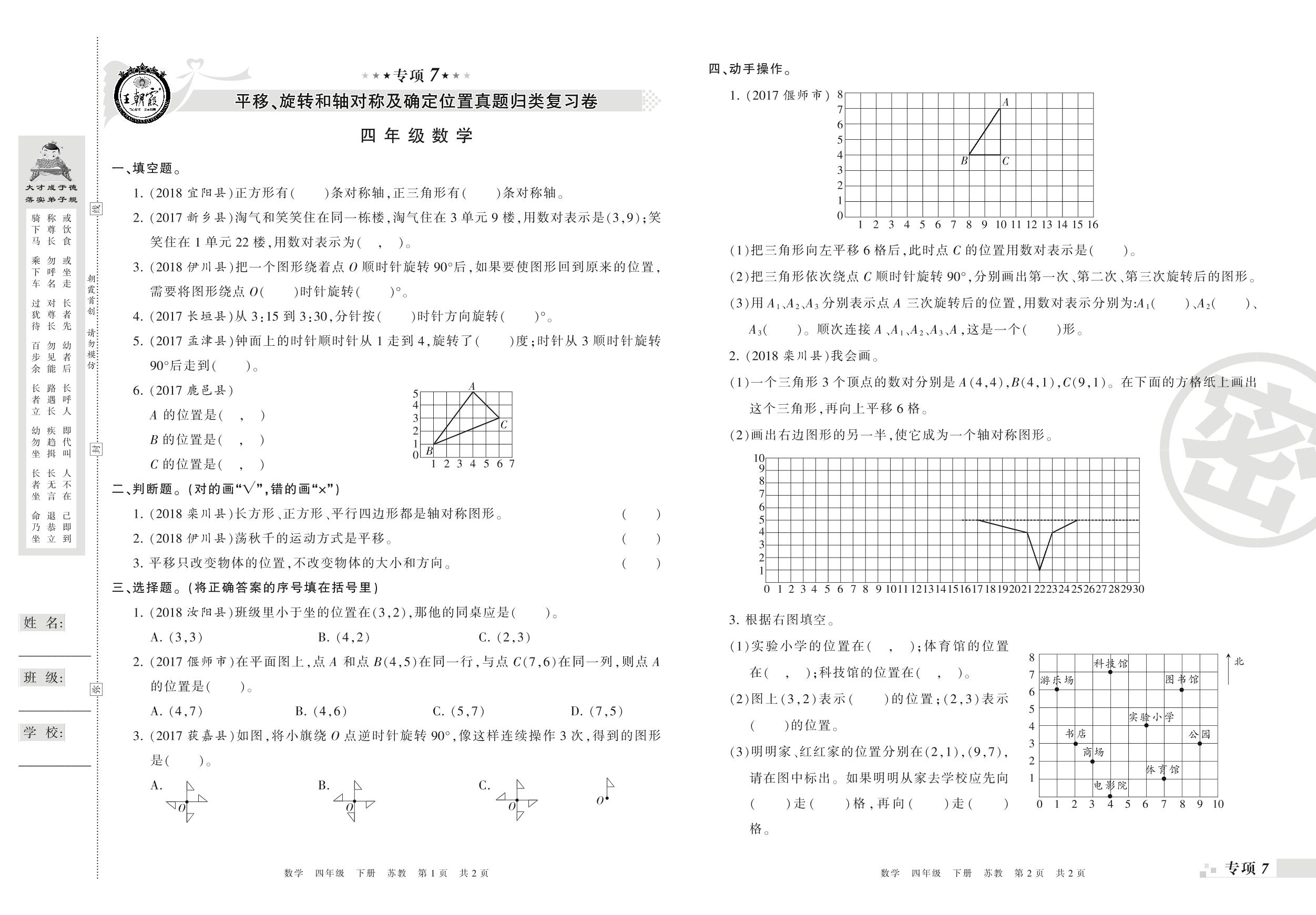 王朝霞期末专项卷——平移、旋转和轴对称及确定位置 用计算器计算及解决问题的策略真题归类复习卷四年级下册数学(苏教版)_R210804145939【0】
