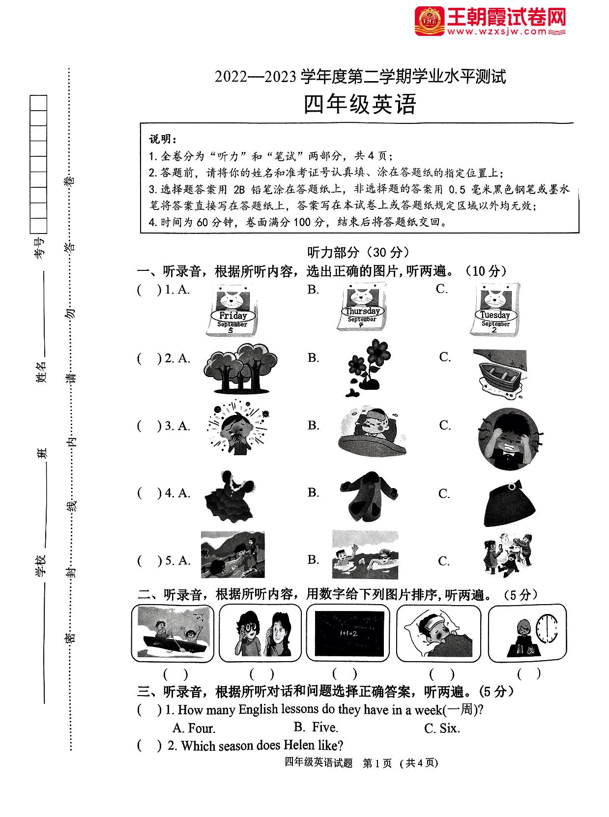 江苏省淮安市清江浦区2022-2023学年第二学期学业水平测试四年级英语(译林版)