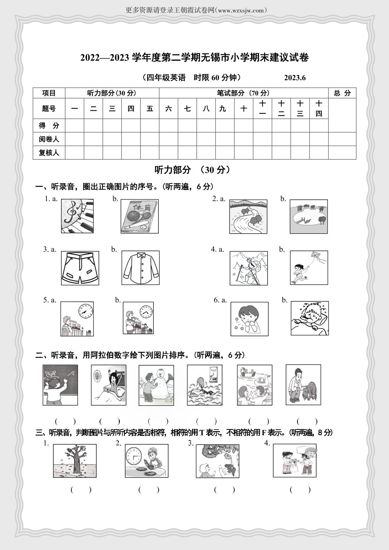 江苏省无锡市2022-2023学年第二学期小学期末建议试卷四年级英语(译林版)