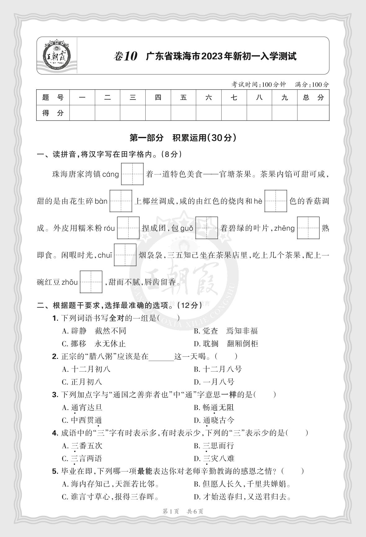 小升初语文·广东省珠海市2023年新初一入学测试【10】
