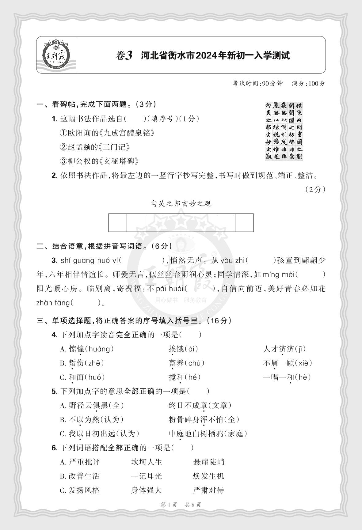 小升初语文·河北省衡水市2024年新初一入学测试【3】