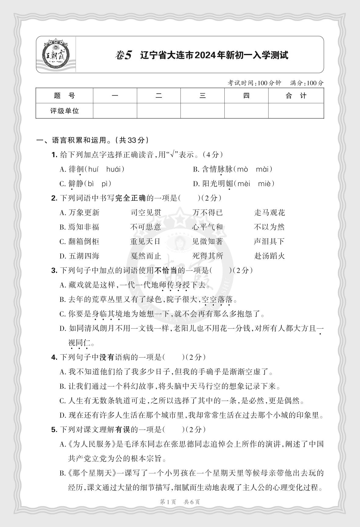 小升初语文·辽宁省大连市2024年新初一入学测试【5】