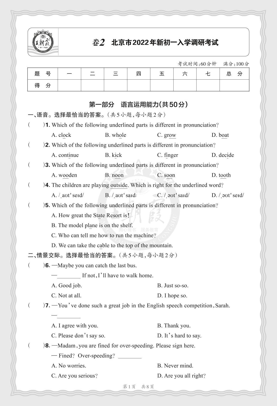小升初英语·北京市2022年新初一入学调研考试【2】