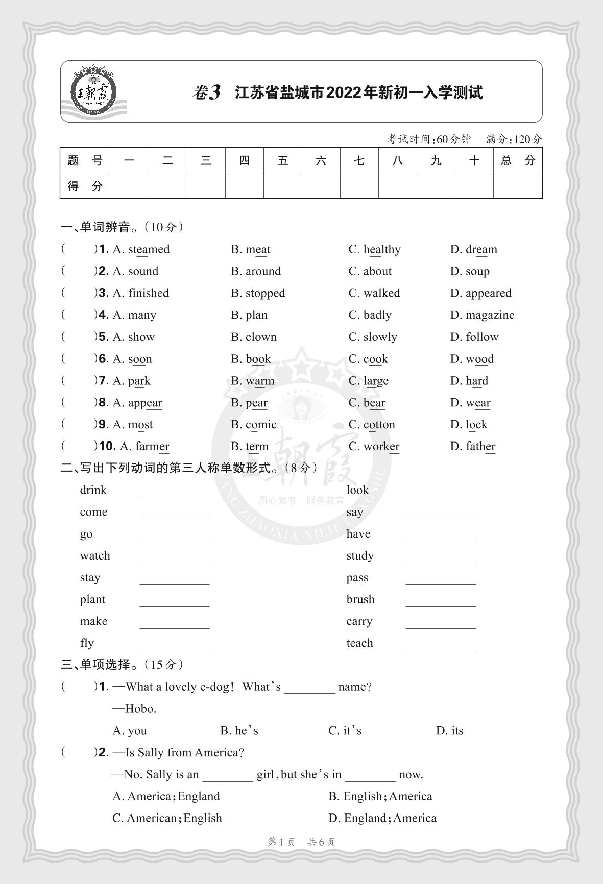 小升初英语·江苏省盐城市2022年新初一入学测试【3】