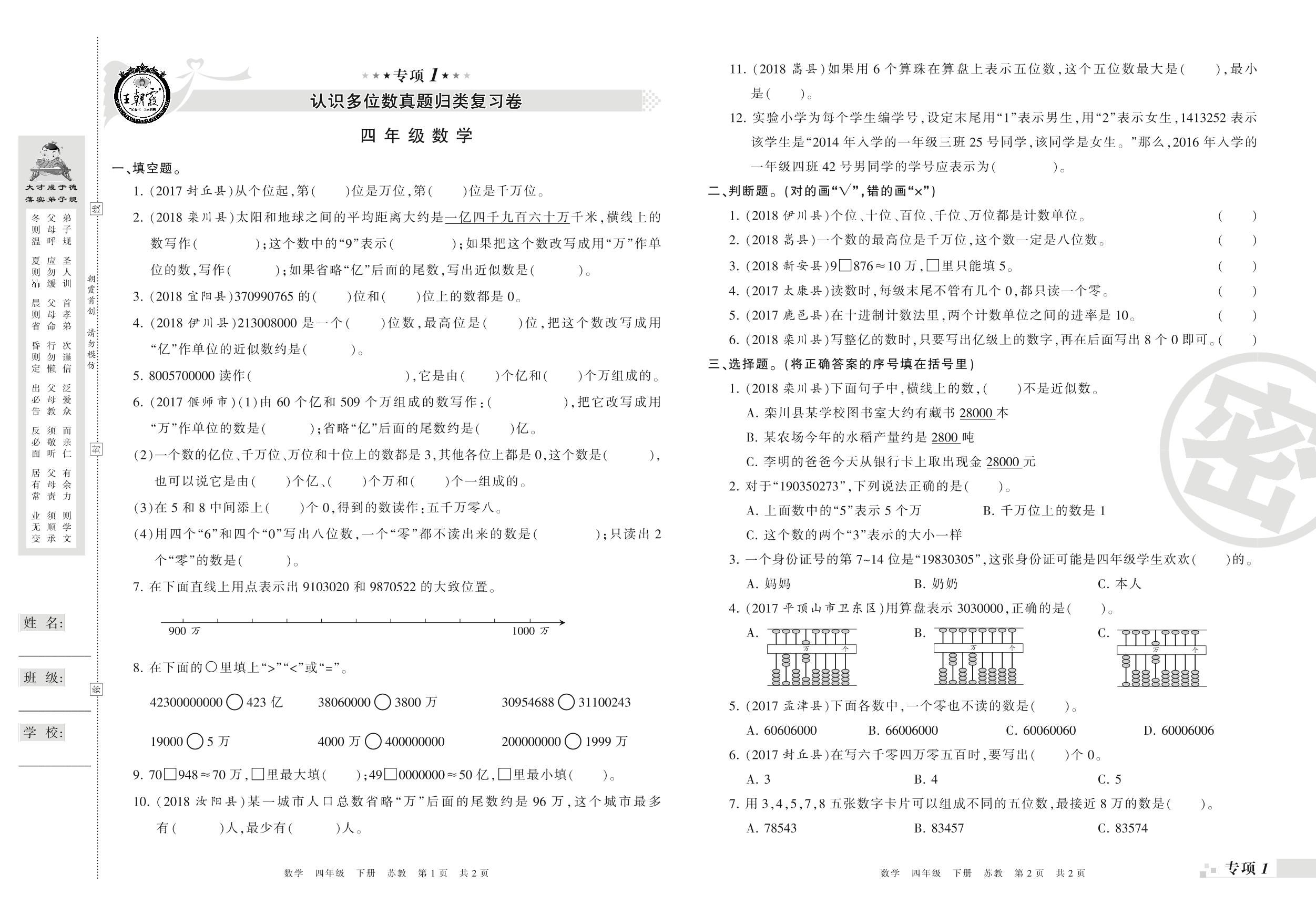 王朝霞期末专项卷——认识多位数、三位数乘两位数(一)真题归类复习卷四年级下册数学(苏教版)_R210804145950【0】