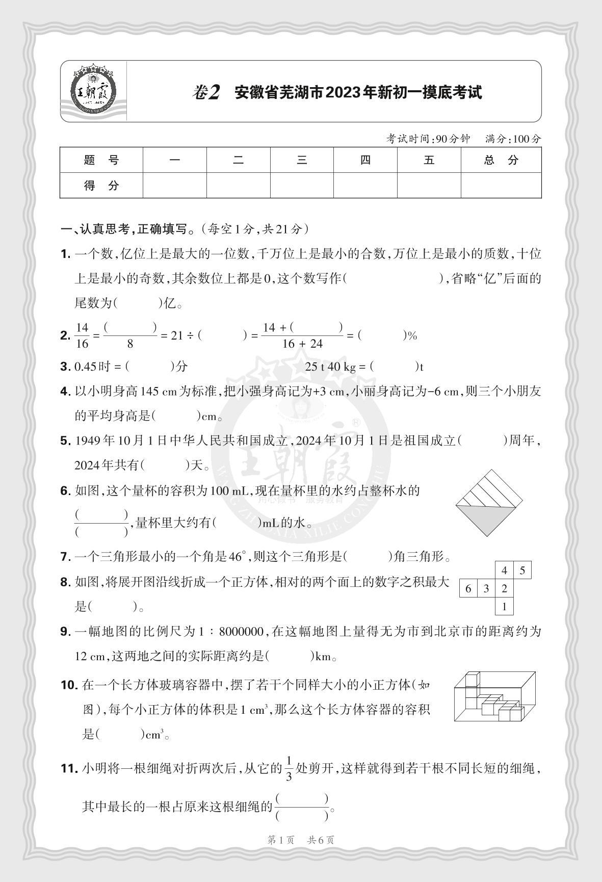 小升初数学·安徽省芜湖市2023年新初一摸底考试【2】